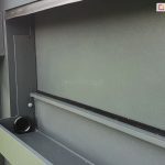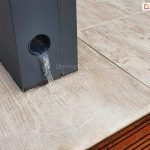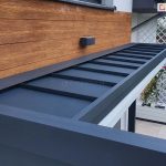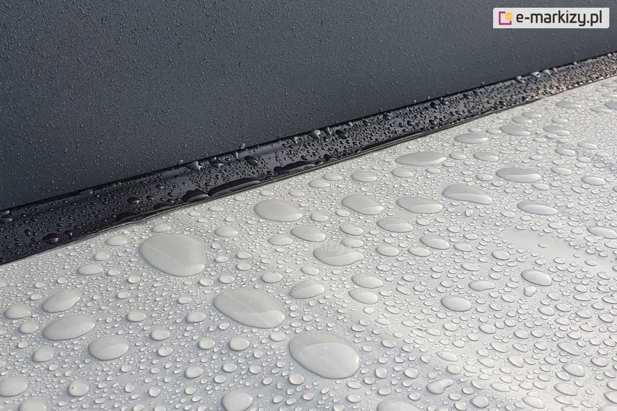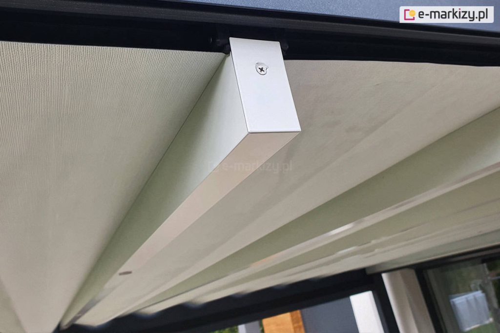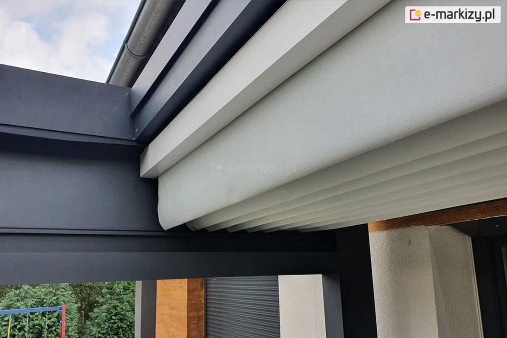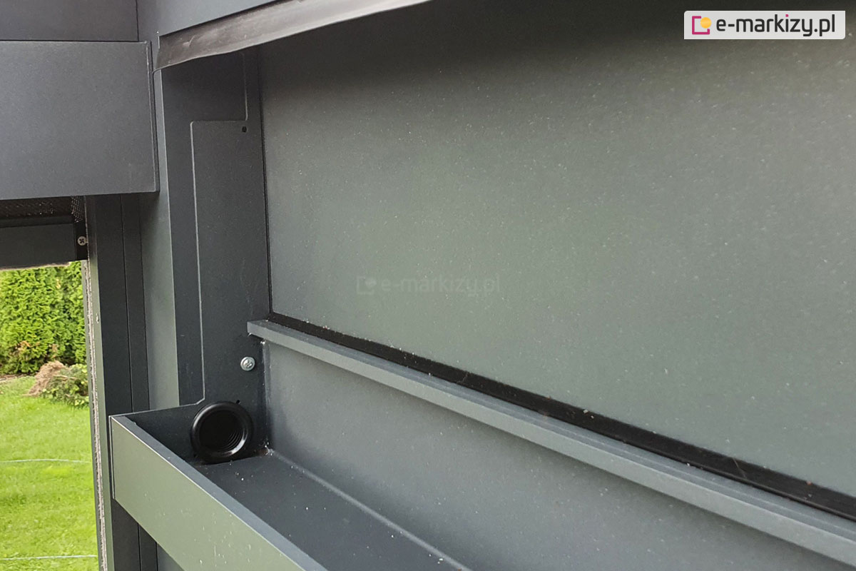 - Po lewej stronie pergoli zamontowana jest rynna, która odprowadza wodę deszczową z dachu do podpór konstrukcji. Pergola wyposażona jest także w daszek chroniący tkaninę dachu.