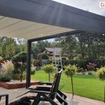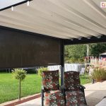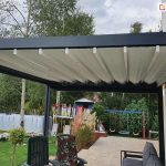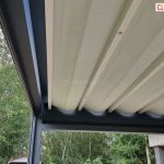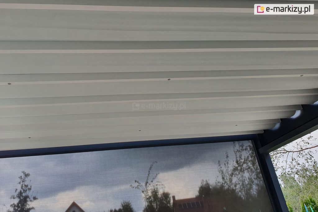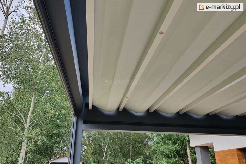 - Dach pergoli wykonany jest z tkaniny Opatex blokującej promieniowanie świetlne, cieplne oraz UV, jest w 100% wodoodporna. Tkanina jest w kolorze od góry szary od dołu jasno szary.