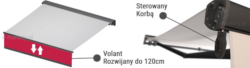 W markizie Jamaica, jest możliwość wykonania falbany rozwijanej- Volant. Falbana jest rozwijana korbą, a jej długość maksymalna to 120cm. Volant to dodatkowa ochrona przed promieniami słońca, ale także osłona powierzchni przed wścibskimi spojrzeniami i podmuchami wiatru.