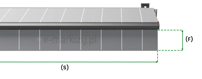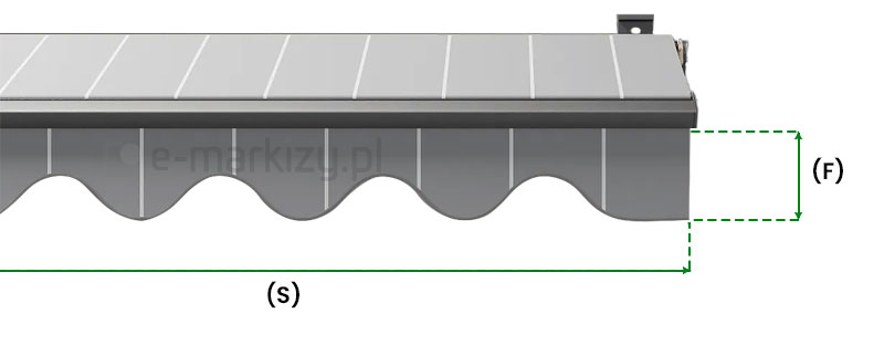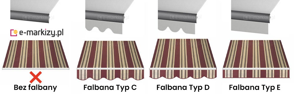 Informacje o falbanach markizowych firmy Selt. Falbana do markiz tarasowych jest łatwo demontowalna. Występuje w trzech kształtach: C,D,E. Wysokość falbany (F) to 21cm. Są one obszyte grubą lamówką i posiadają pręt zaszyty w kieszonce. Falbana jest wsunięta w belkę przednią markizy.