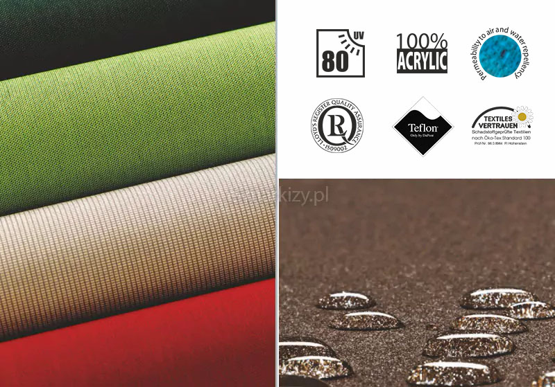 ZALETY: trwałość kolorów, wysoka odporność na działanie światła i czynników atmosferycznych, odporność na rozdarcia pod względem dużych naprężeń, przepuszczalność powietrza przy jednoczesnej odporności na wodę. Wszystkie materiały akrylowe zostały zaimpregnowane środkiem ochronnym TEFLON lub SCOTCHGARD. Stwarza to doskonałą barierę ochronną i wzmacnia właściwości hydrofobowe tkanin, a ponadto zapobiega przywieraniu zabrudzeń do materiału. Należy pamiętać, iż takie czynniki jak kwaśny deszcz zanieczyszczenia pochodzenia zwierzęcego oraz czyszczenie materiału za pomocą środków ścierających mogą zniszczyć ochronne pokrycie.