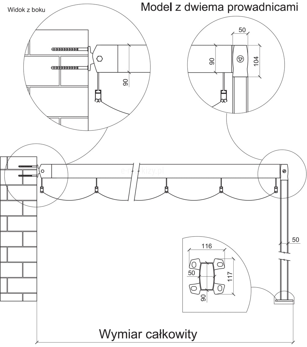 Pergola Costa Corner Przyścienna – Pomiar i Dane techniczne - Pergola narożnikowa costa corner rozstaw prowadnic, Pergola przyścienna narożnikowa costa corner widok z boku, Pergola przyścienna narożnikowa costa corner widok z przodu 2 prowadnice