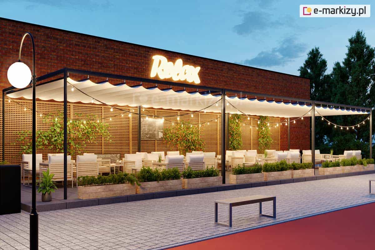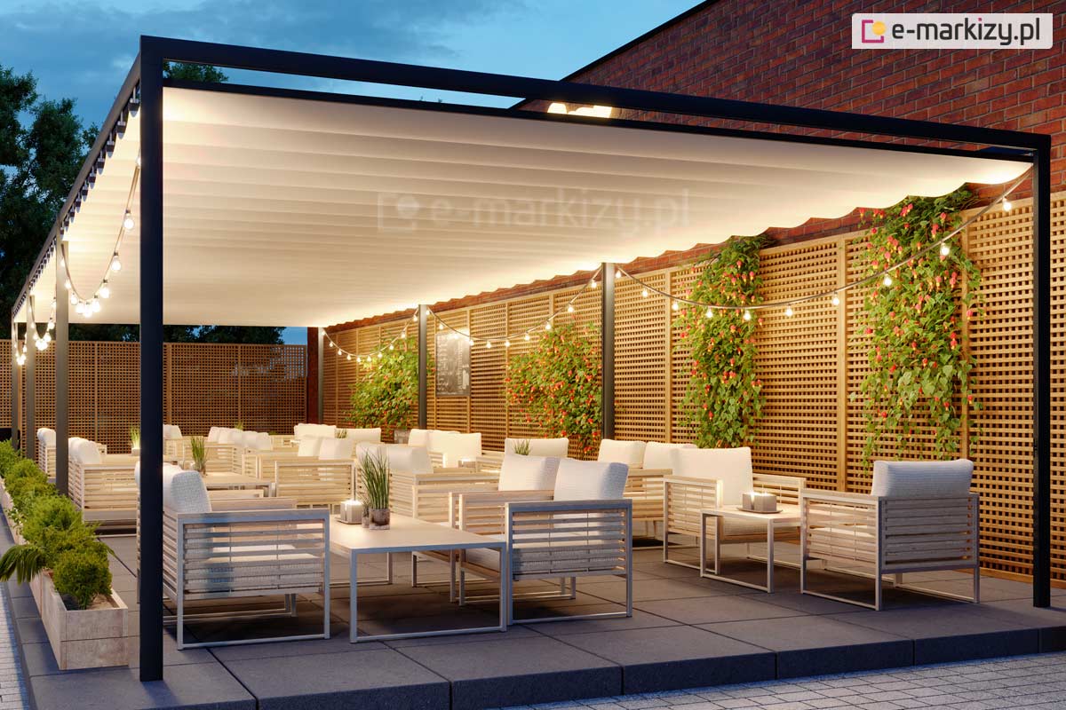 Pergola Costa Corner szczególnie zalecana jest na tarasy i ogródki gastronomiczne. Sterowana manualnie pergola, wykonana z ekstrudowanych profili aluminiowych jest trwała i stabilna – odporna na wiatr. Tkanina zamocowana do belek przeciw-wietrznych, układa się w dekoracyjne fale. Faliście ułożony materiał zadaszenia skutecznie chroni przed słońcem i deszczem, jednocześnie w prosty i skuteczny sposób odprowadza wodę deszczową do czoła zadaszenia. Pergola narożnikowa szczególnie zalecana do montażu modułowego lub obudowy roletami SCREEN.