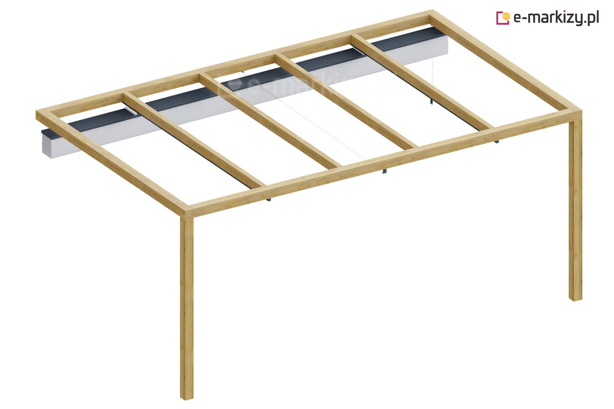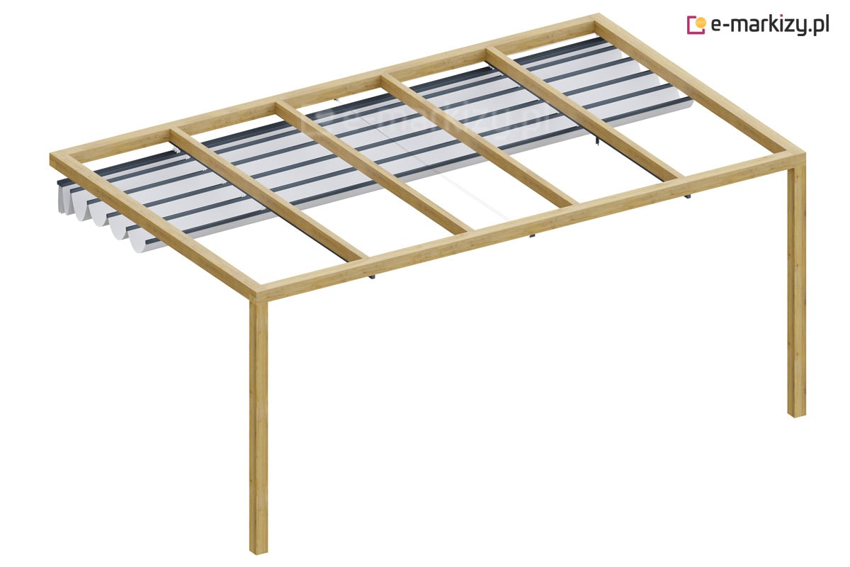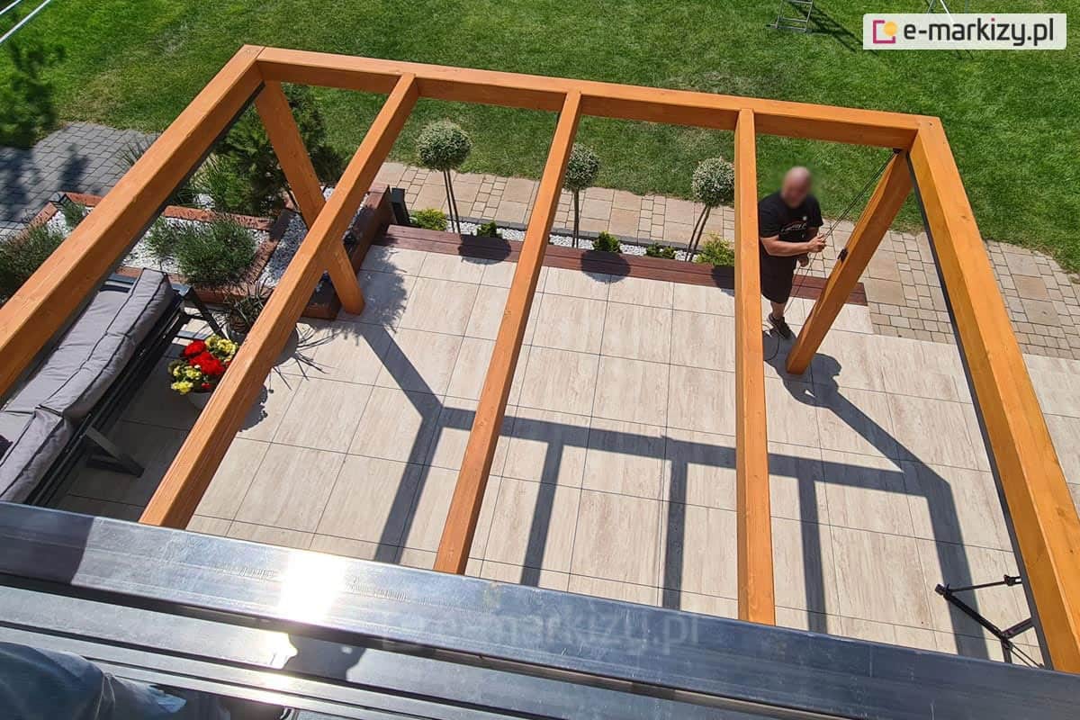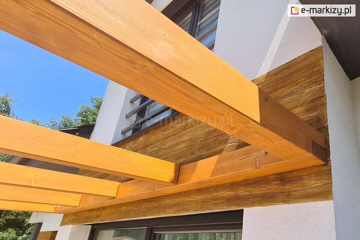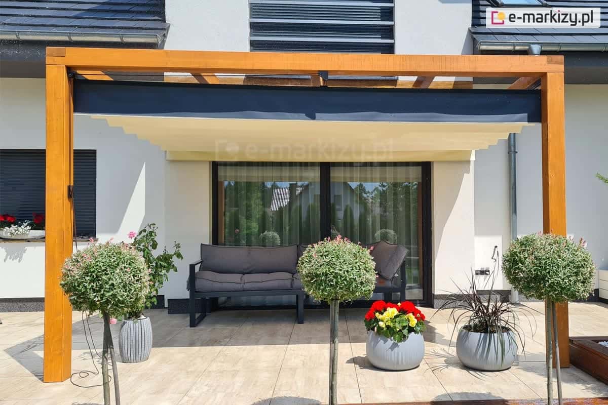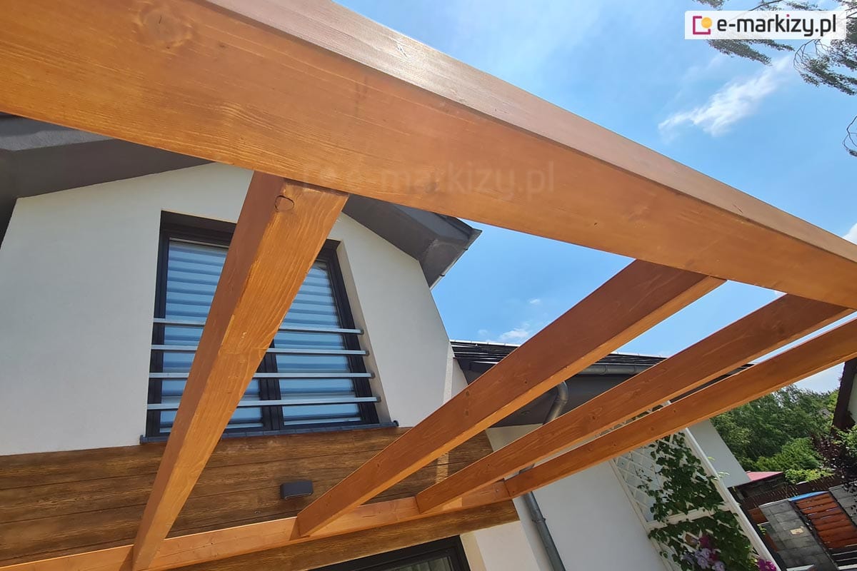 Drewniana konstrukcja pergoli tarasowej wykonywana jest na wymiar. Na życzenie klienta, konstrukcja pergoli może zostać pokryta lakierobejcą drewnopodobną, która dodatkowo zabezpiecza drewno przed warunkami atmosferycznymi, jednak w przypadku chęci uzyskania konkretnego koloru RAL, do pokrycia konstrukcji zadaszenia stosuje się farbę akrylową zewnętrzną. Pergola ścienna mocowana jest do ściany, a z przodu wsparta jest na dwóch podporach. Dla ochrony przestrzeni na tarasie przed promieniami słonecznymi oraz deszczem, do konstrukcji montowany jest ruchomy dach tkaninowy pergoli, rozwijany ręcznie.