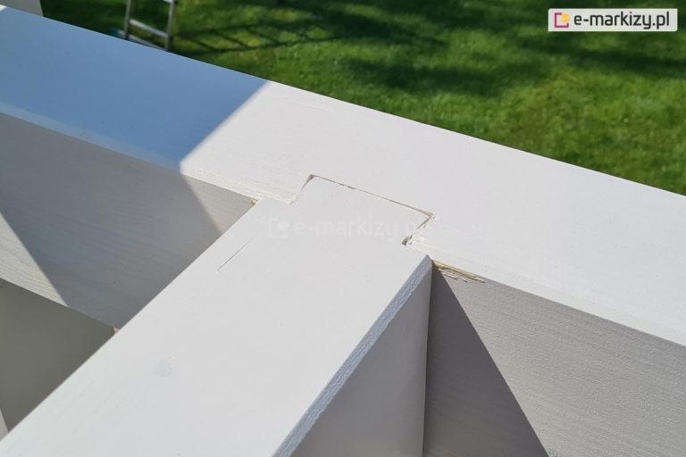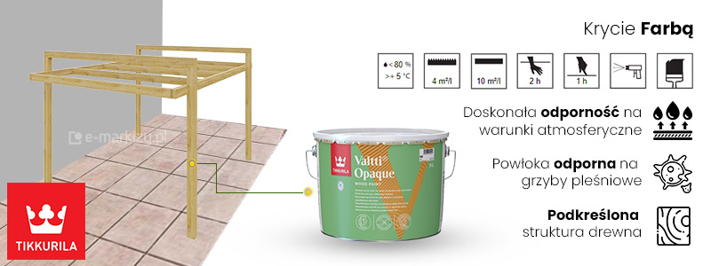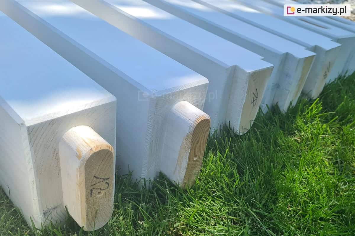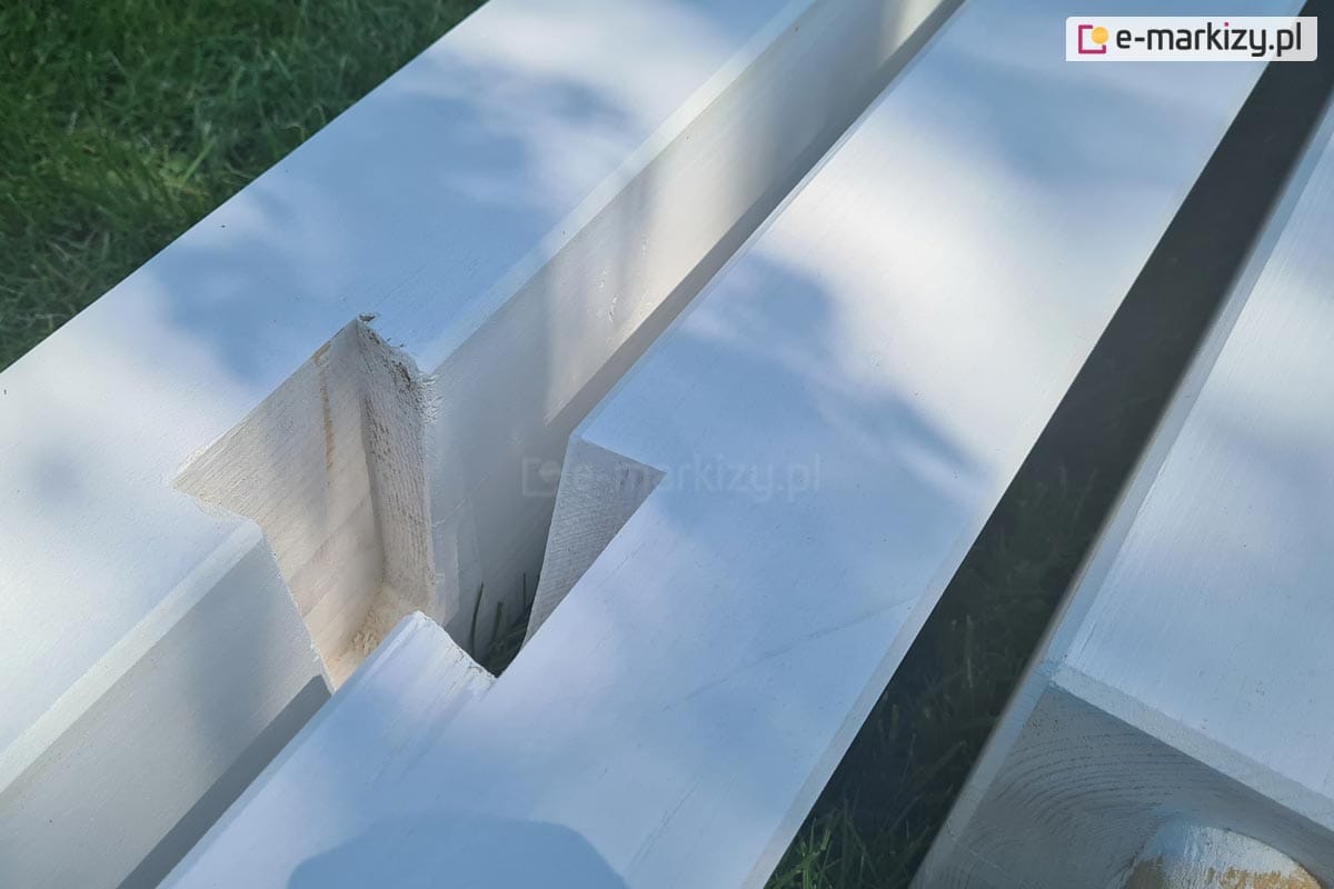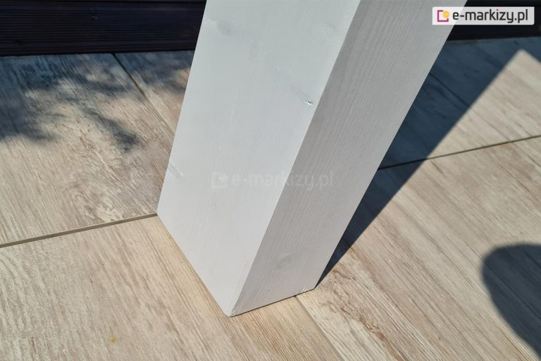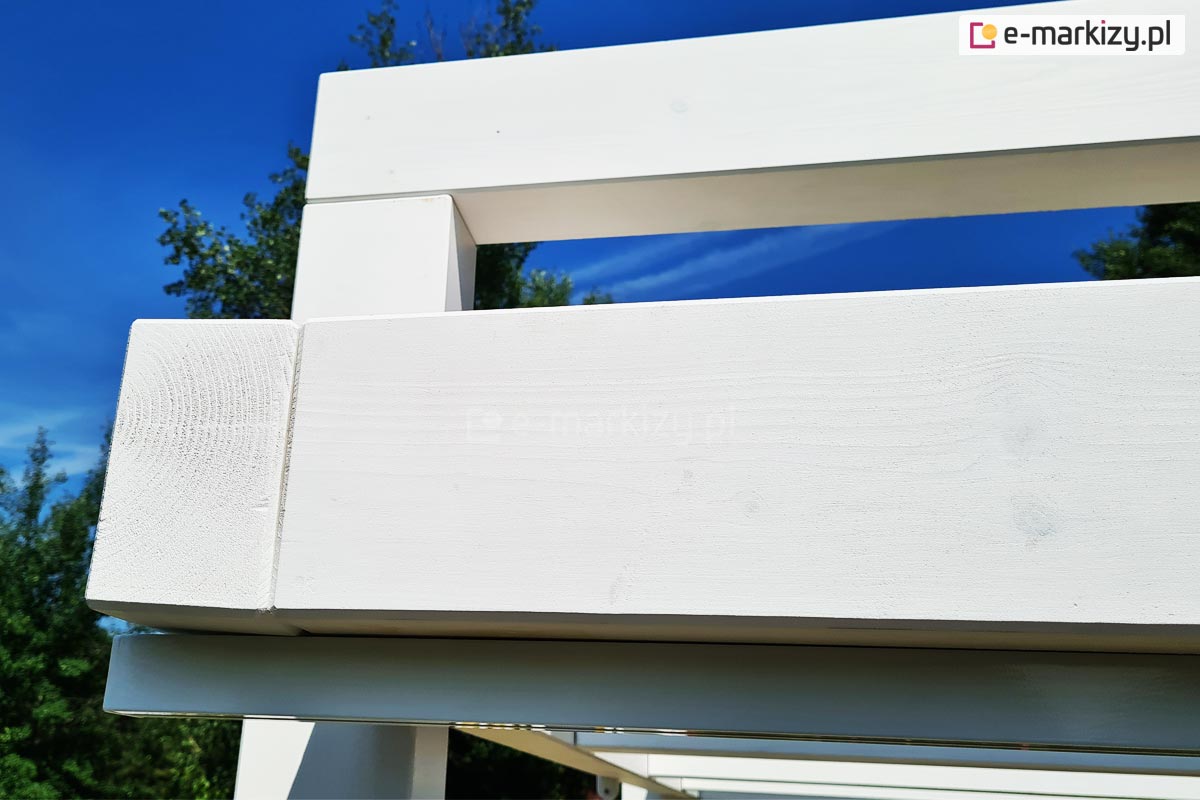Do pokrycia konstrukcji pergoli, wykorzystywana jest wysokiej jakości farba do ochrony i dekoracji drewna, podkreślająca rysunek drewna oraz zabezpieczająca przed wilgocią i promieniami UV.