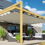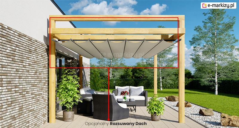 Funkcjonalna pergola ogrodowa drewniana wyposażona może być w opcjonalny dach rzymski.
