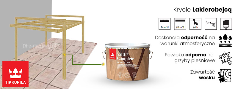 Do pokrycia konstrukcji pergoli, wykorzystywana jest bardzo trwała, półmatowa, impregnująco-dekorująca lakierobejca do malowania drewna na zewnątrz pomieszczeń. Stworzona na bazie innowacyjnej technologii Triple Resin System, opartej na unikalnym połączeniu trzech wysokiej jakości żywic o różnej funkcjonalności, które gwarantują zwiększoną odporność na warunki atmosferyczne, a także zabezpieczenie pomalowanej powłoki. Dzięki pokryciu konstrukcji lakierobejcą Twoja pergola drewniana w ogrodzie będzie odporna na warunki atmosferyczne, nie tracąc swego naturalnego uroku.