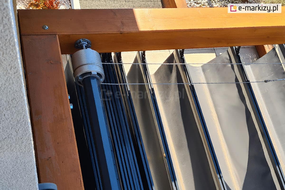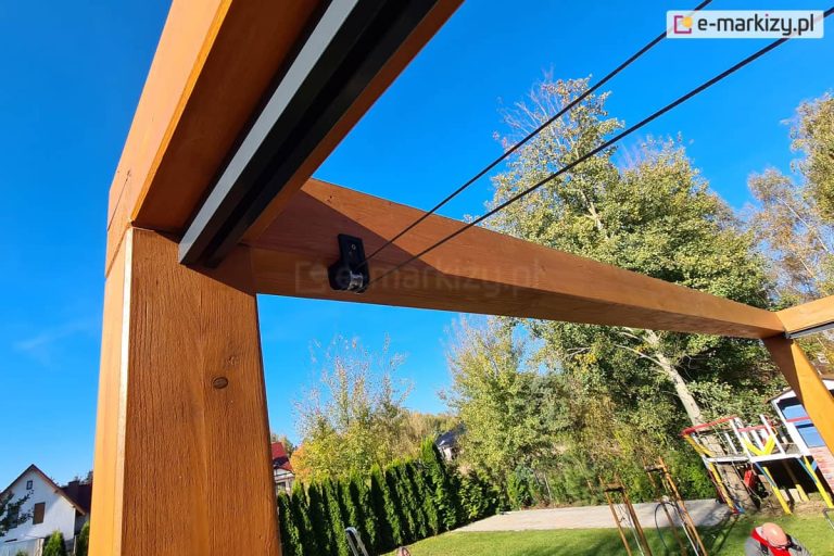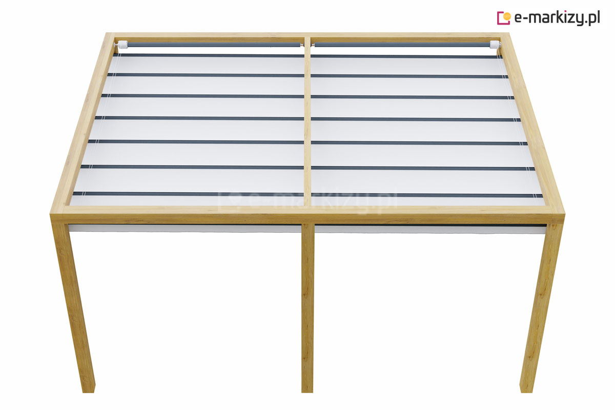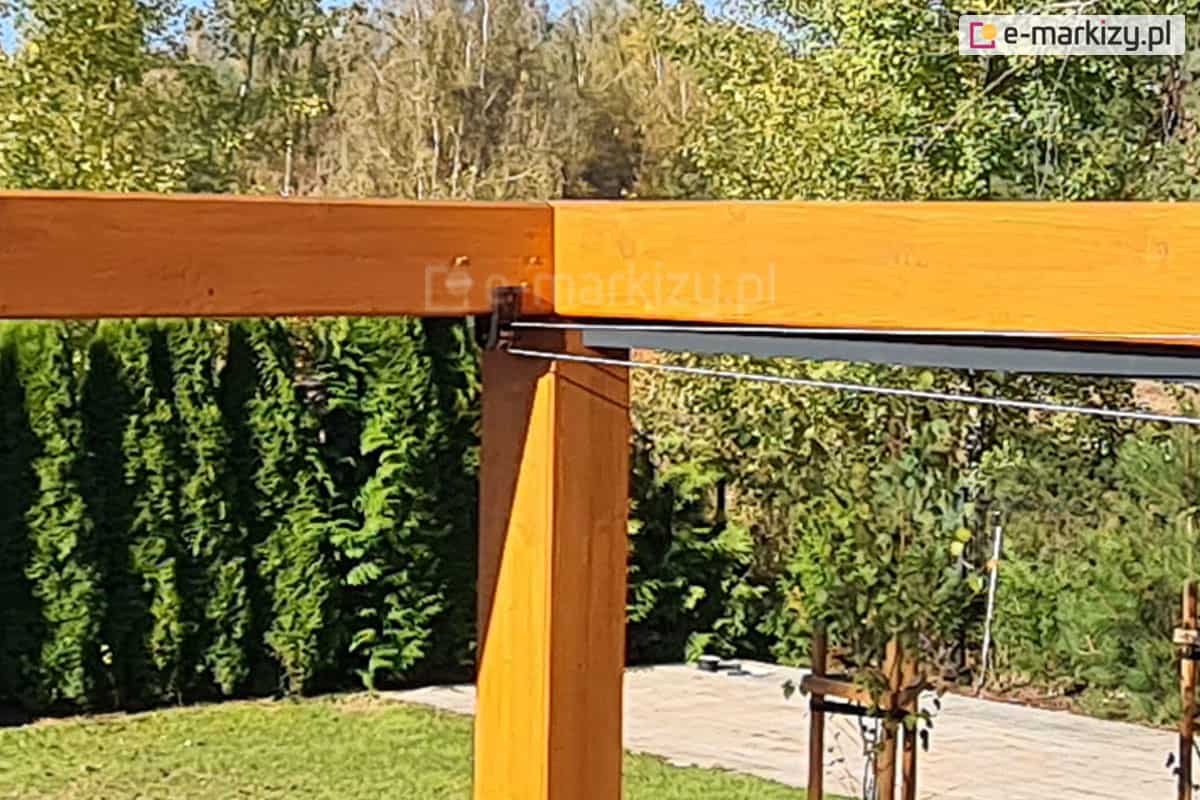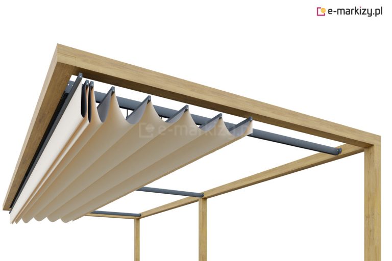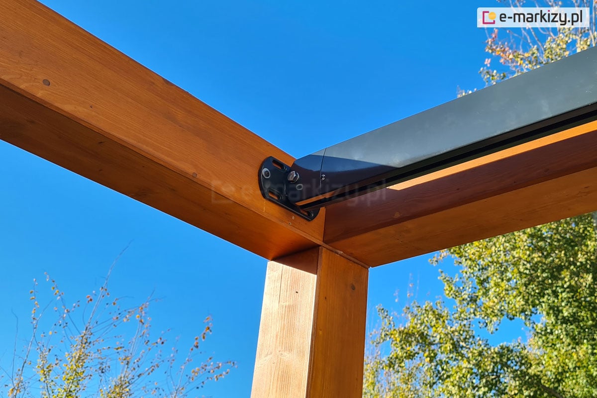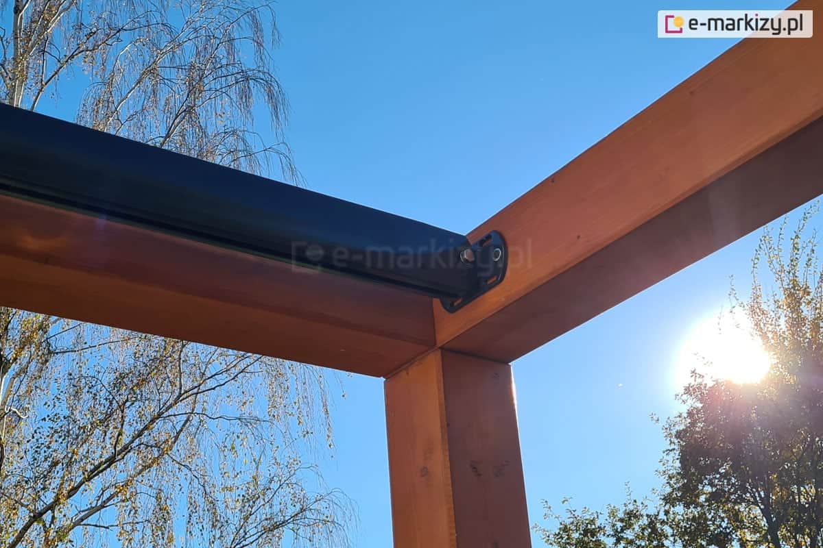 Dach podwieszany jest na prowadnicach aluminiowych do konstrukcji drewnianej od dołu belki lub do jej boku.