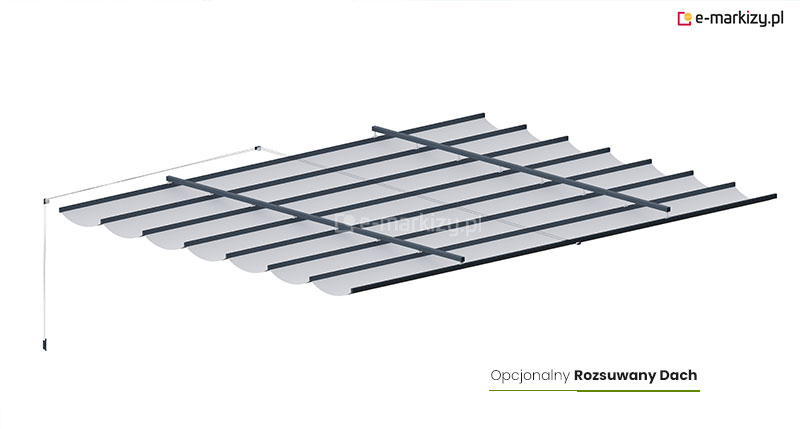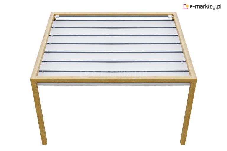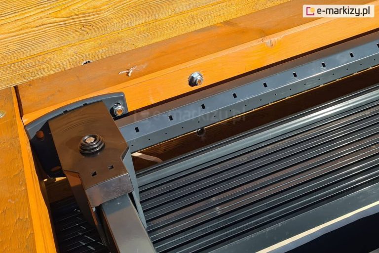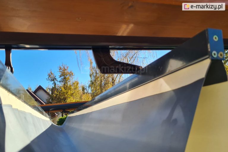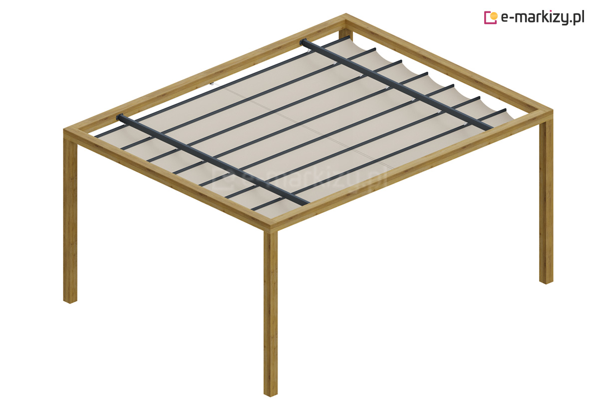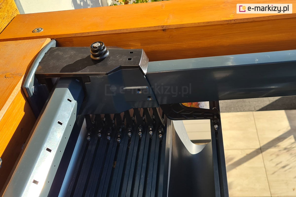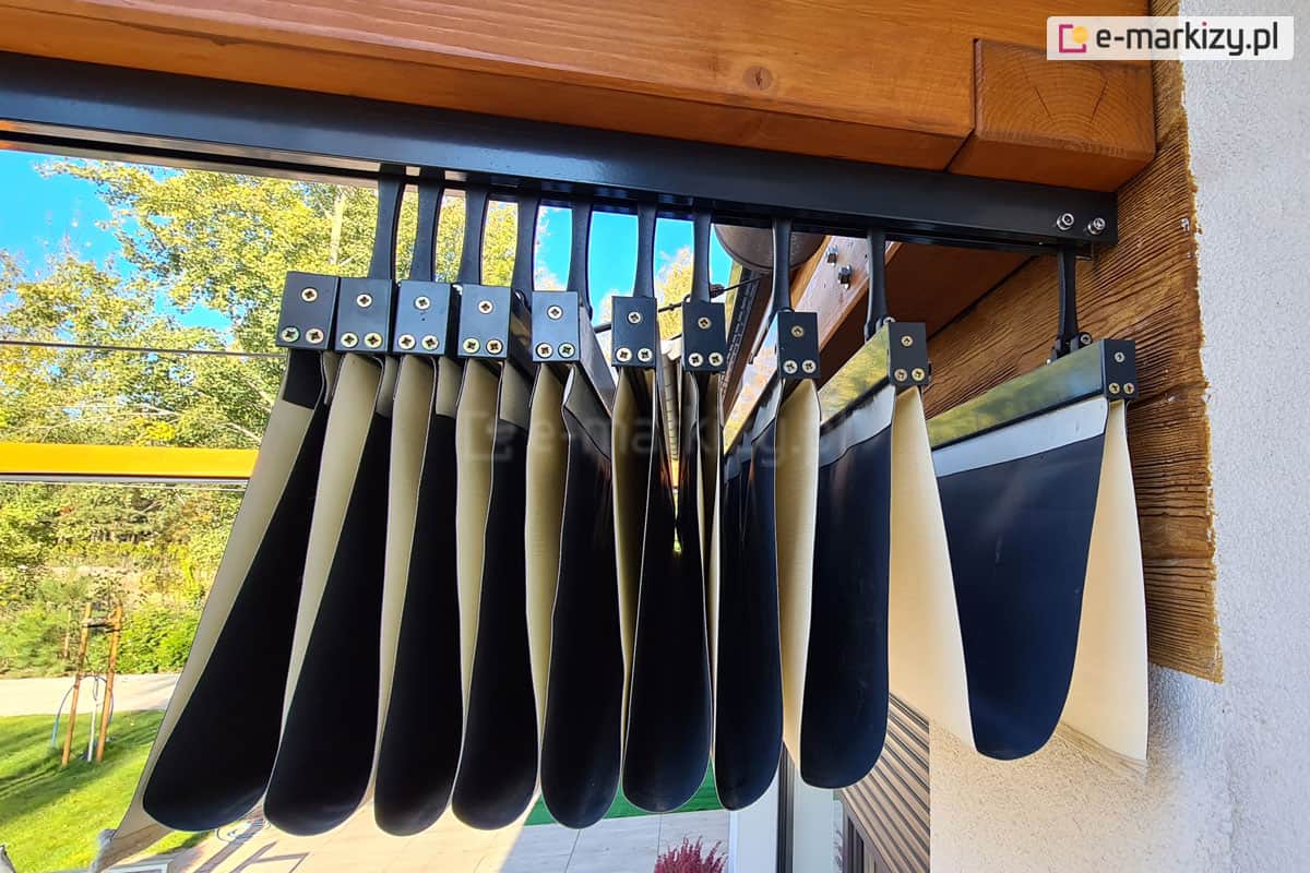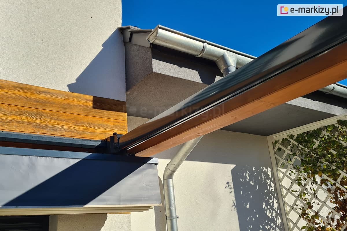 Dach podwieszany jest na prowadnicach aluminiowych do konstrukcji drewnianej od dołu belki lub do jej boku.