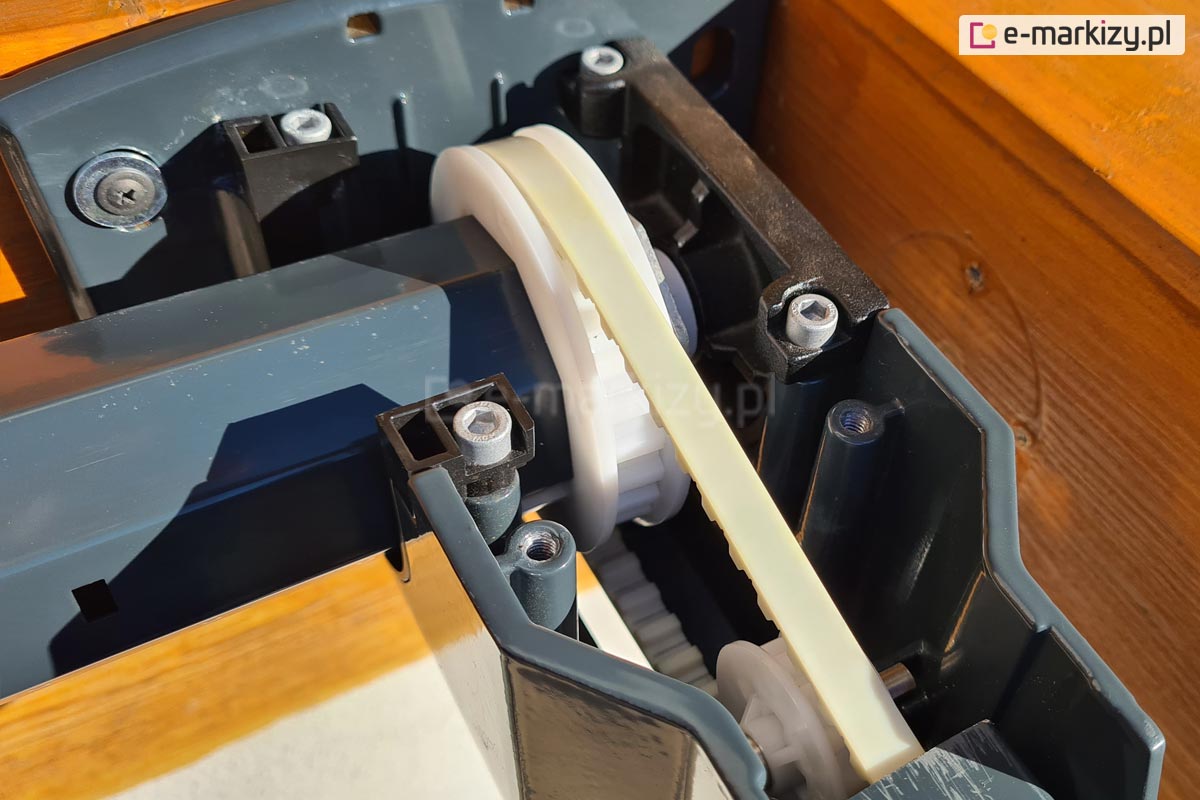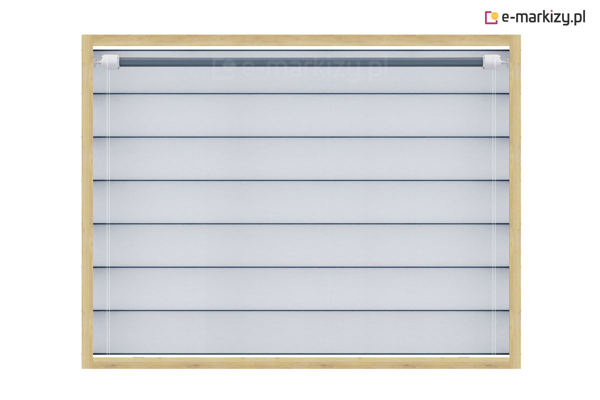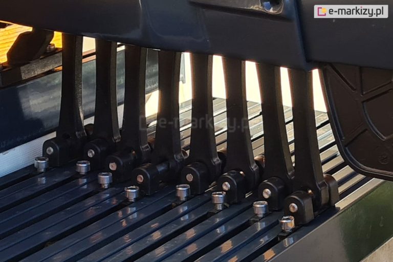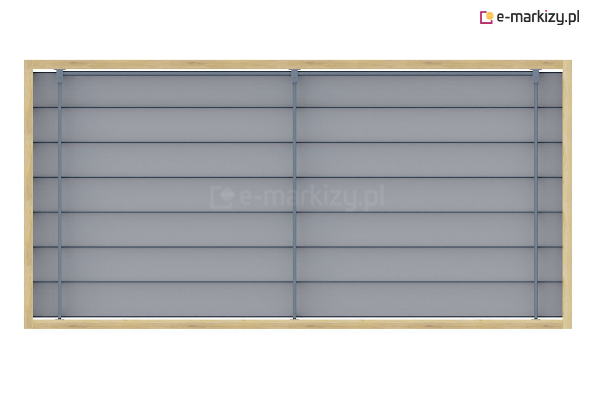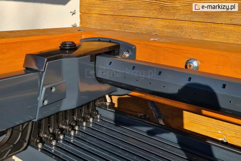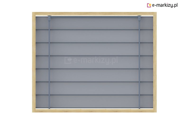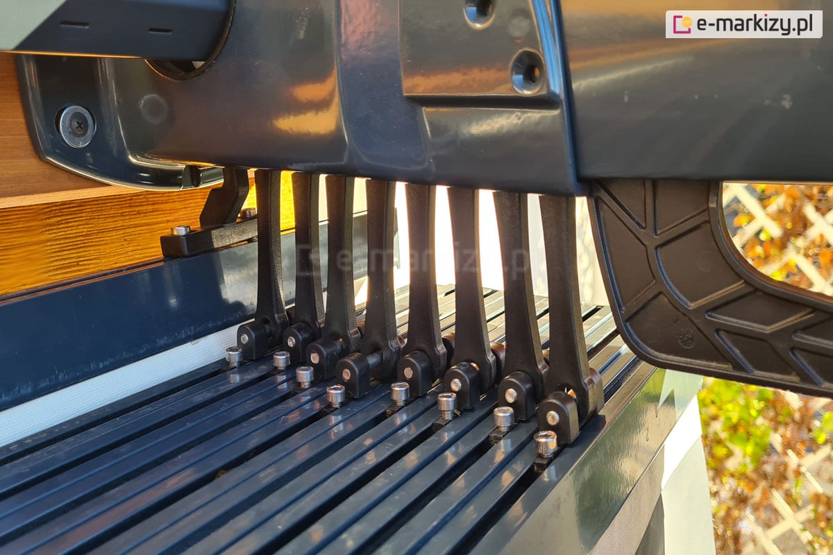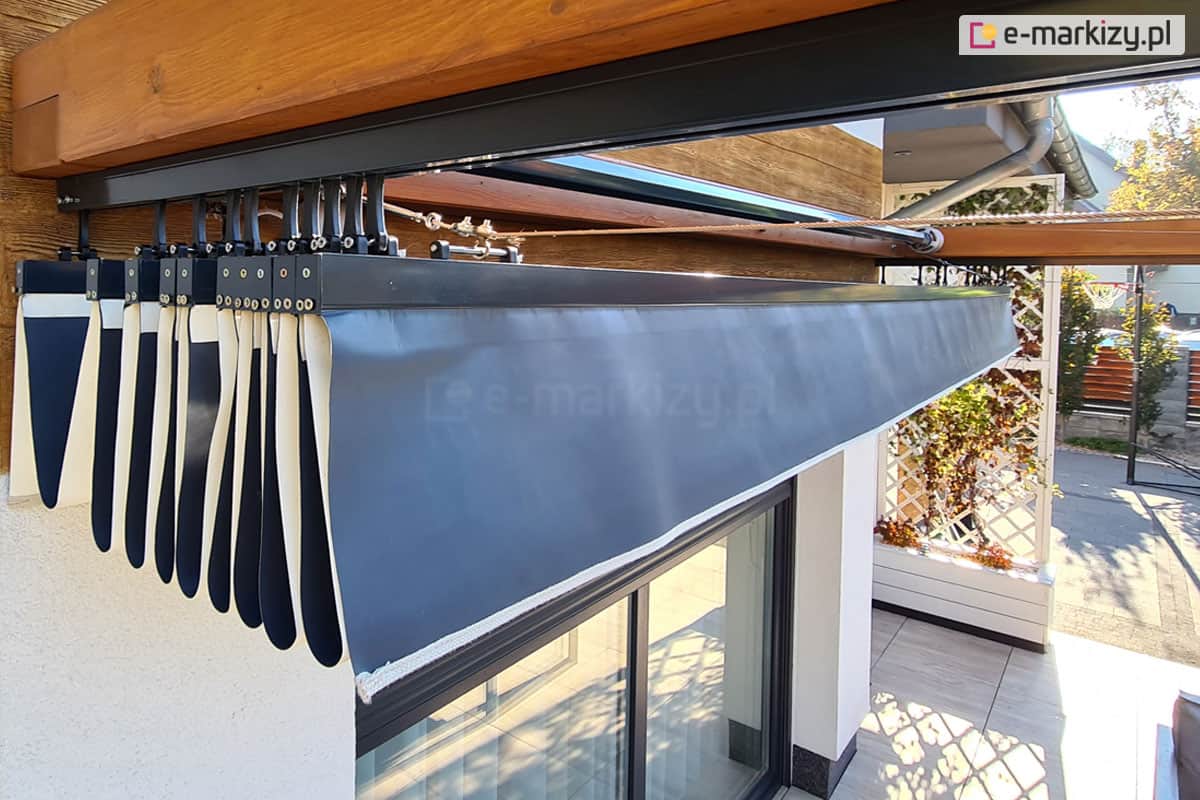 Dach podwieszany jest na prowadnicach aluminiowych do konstrukcji drewnianej od dołu belki lub do jej boku.