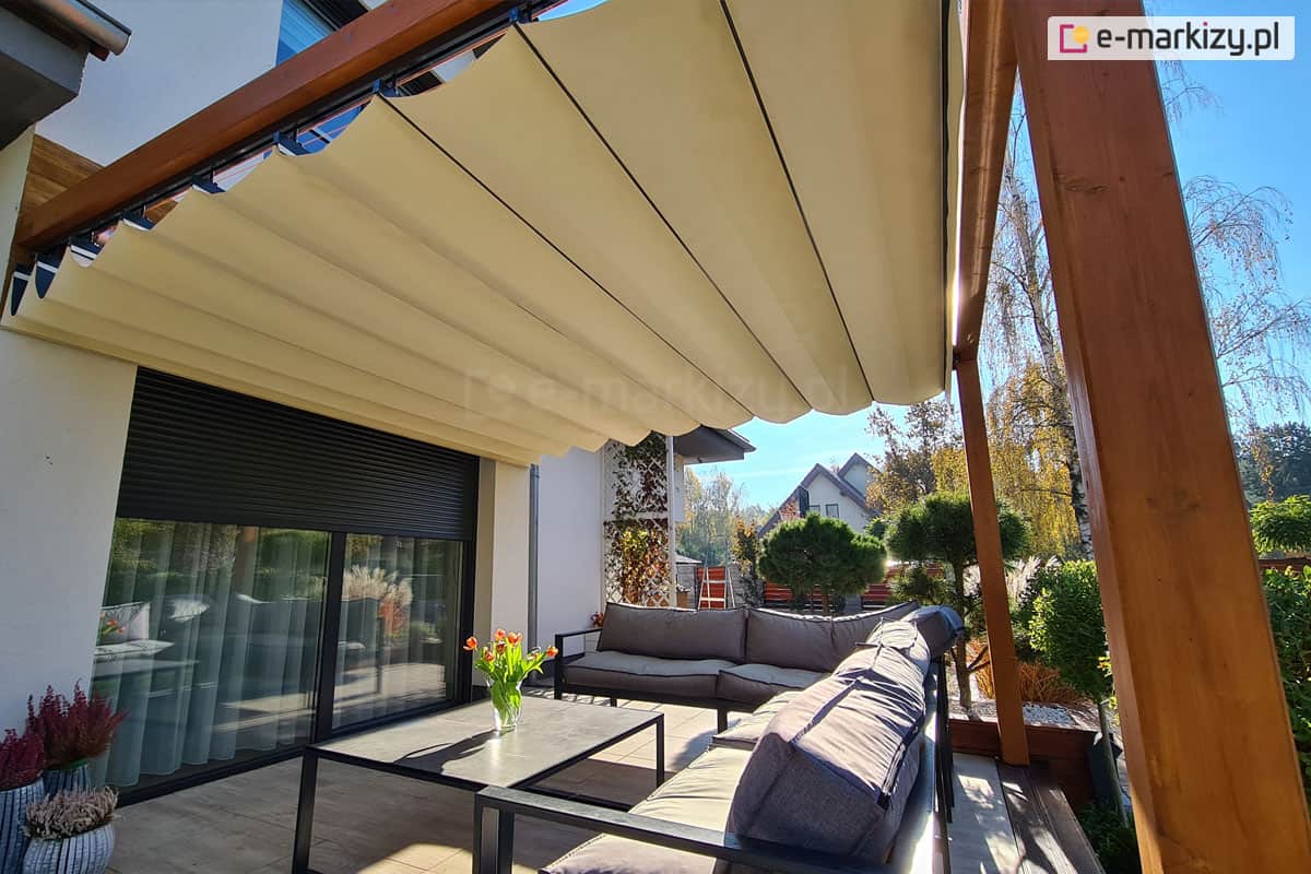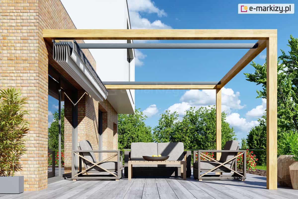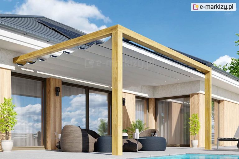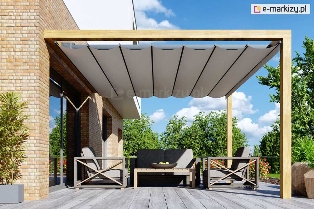 Taras drewniany zadaszony nowoczesny można wyposażyć w dach rzymski Silva. Wyjątkowa konstrukcja dachu sprawia, że może on być wykorzystany między ścianami lub między belkami pergoli, a także podwieszony na prowadnicy. Sterowany manualnie lub automatycznie dach rzymski na patio ogrodowe, wykonany jest z ekstrudowanych profili aluminiowych, trwały i stabilny – odporny na wiatr. Tkanina zamocowana do belek przeciw-wietrznych, układa się w dekoracyjne fale, jak klasyczny dach rzymski.
