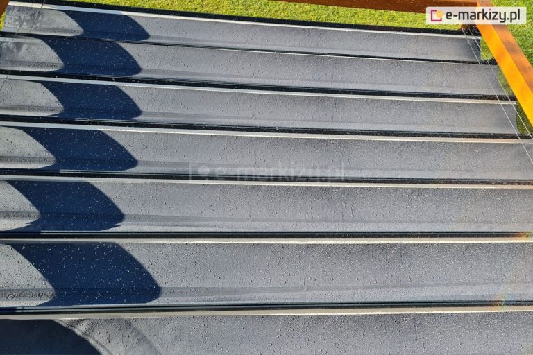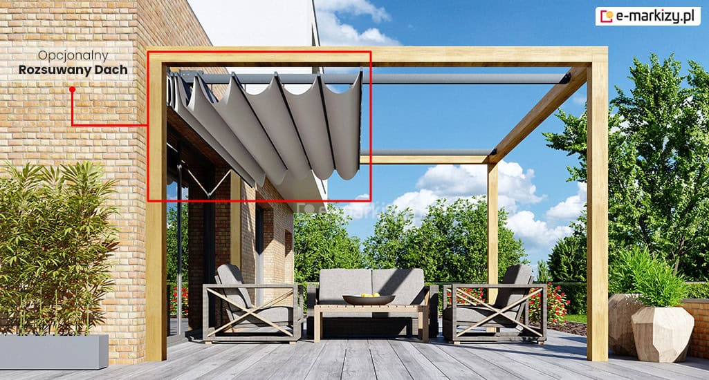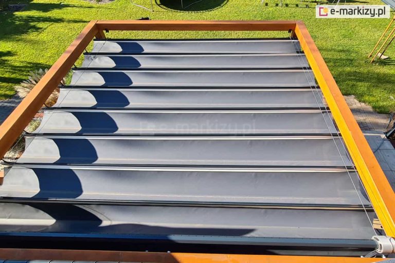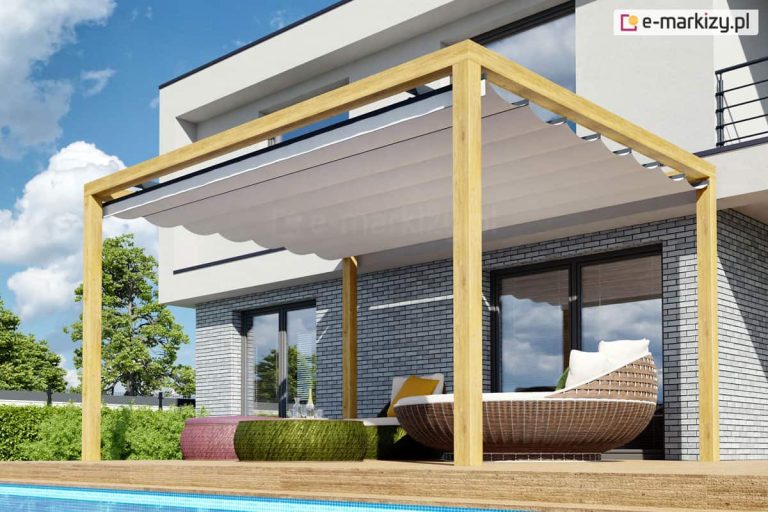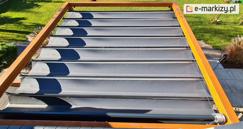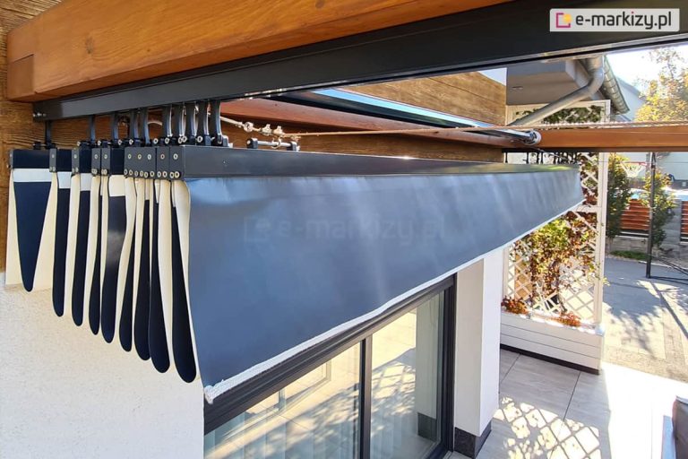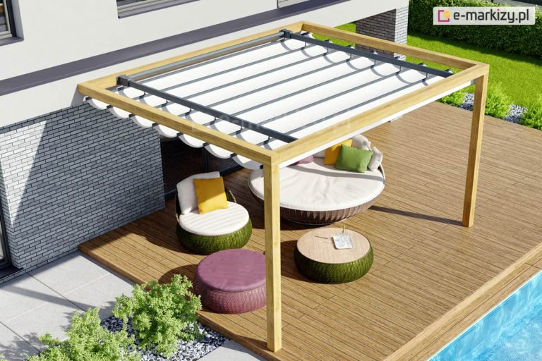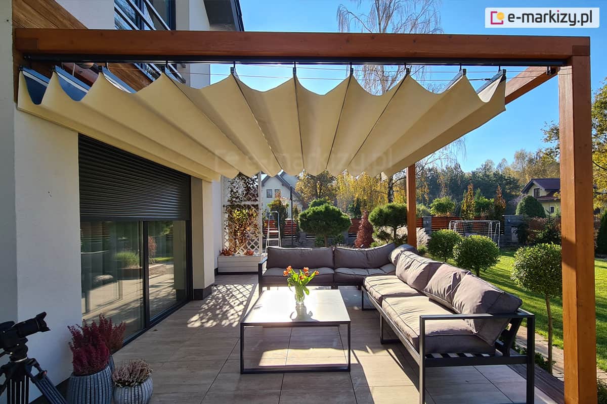Taras drewniany zadaszony nowoczesny można wyposażyć w dach rzymski Silva. Wyjątkowa konstrukcja dachu sprawia, że może on być wykorzystany między ścianami lub między belkami pergoli, a także podwieszony na prowadnicy. Sterowany manualnie lub automatycznie dach rzymski na patio ogrodowe, wykonany jest z ekstrudowanych profili aluminiowych, trwały i stabilny – odporny na wiatr. Tkanina zamocowana do belek przeciw-wietrznych, układa się w dekoracyjne fale, jak klasyczny dach rzymski.