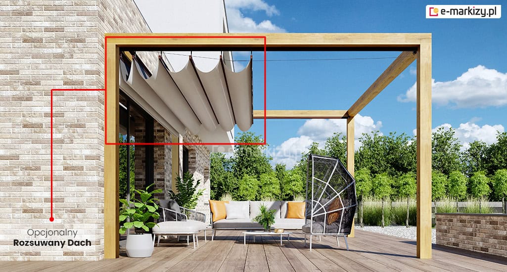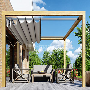 Dach poziomy rzymski Supro może być wykorzystany na gotowych konstrukcjach drewnianych poprzez podwieszenie na prowadnicach do boku lub dołu belki pergoli. Wiata tarasowa może posiadać dach sterowany manualnie lub automatycznie. Dach tkaninowy opiera się na systemie szyn dachowych (aluminiowych), w których poruszają się specjalne łożyskowane wózki tkaninowe. Tkanina zamocowana do belek przeciw-wietrznych, układa się w dekoracyjne fale.
