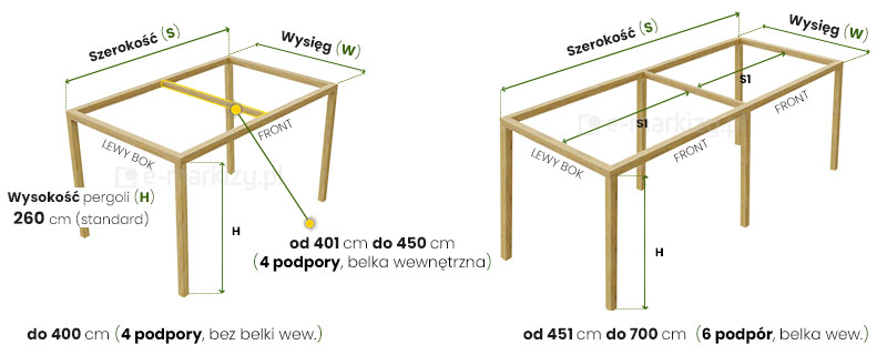 Pergola Drewniana Koro Wolnostojąca produkowana jest na wymiar. Jeżeli chodzi o szerokość to nie ma standardowych rozmiarów. Maksymalna szerokość to 700cm, a maksymalny wysięg to 400cm. Altany ogrodowe pergole posiadają standardową wysokość przednich podpór wynoszącą 260cm. Do zamówienia lub wyceny podajemy zawsze całkowitą zewnętrzną szerokość pergoli.