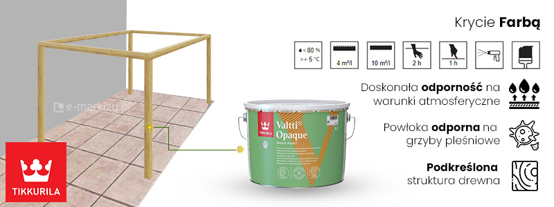 Do pokrycia konstrukcji pergoli, wykorzystywana jest bardzo trwała, półmatowa, impregnująco-dekorująca lakierobejca do malowania drewna na zewnątrz pomieszczeń. Stworzona na bazie innowacyjnej technologii Triple Resin System, opartej na unikalnym połączeniu trzech wysokiej jakości żywic o różnej funkcjonalności, gwarantujących zwiększoną odporność na warunki atmosferyczne i zabezpieczenie pomalowanej powłoki.