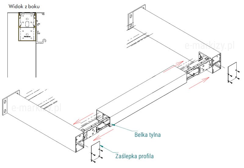 Po połączeniu profili podporowych tylnych z belką tylną, należy zaślepić profile zaślepką górną nogi za pomocą wkrętów 3,5x 16.