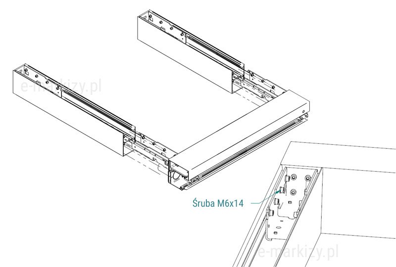 Element należy wsunąć do profila, nastepnie skręcić śrubą M6x14 z kostką znajdującą się w porcie nogi.