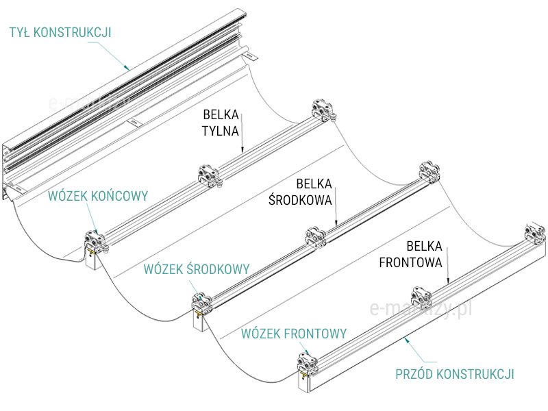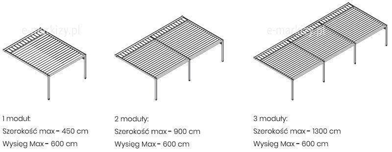 Moduł tkaniny pergoli jest fabrycznie złożony i gotowy do instalacji na konstrukcję pergoli. Moduł tkaniny składa się z belek przeciw wietrznych. Do każdej z belek, doczepione są pasy tkaniny. Cały model należy wpiąć w wózki prowadzące (które są zainstalowane fabrycznie w prowadnice pergoli).