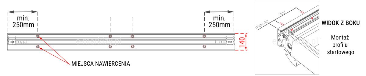 Profil startowy przykręcamy do ściany w kilku miejscach, w zależności od szerokości pergoli. Wysokość profila startowego to 140mm (profil fabrycznie nie jest nawiercony).