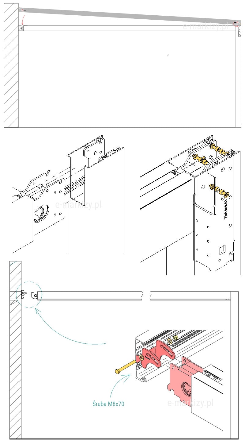 Zawieś prowadnicę na uchwycie w profilu startowym, a następnie skreć za pomocą śruby M8x70.