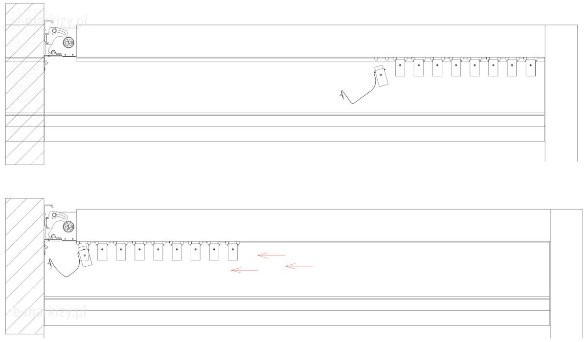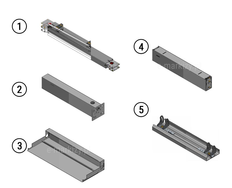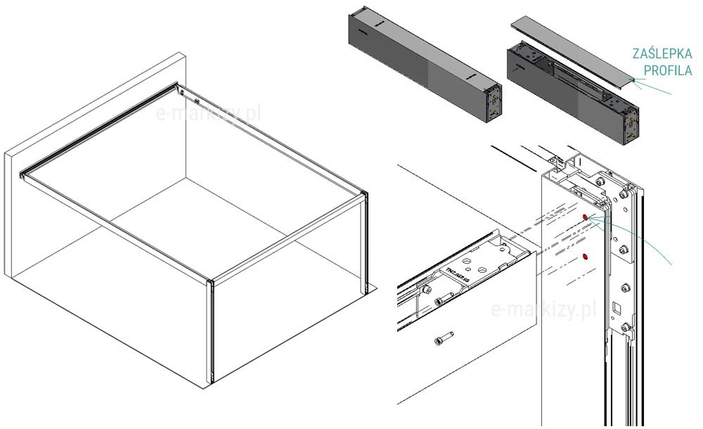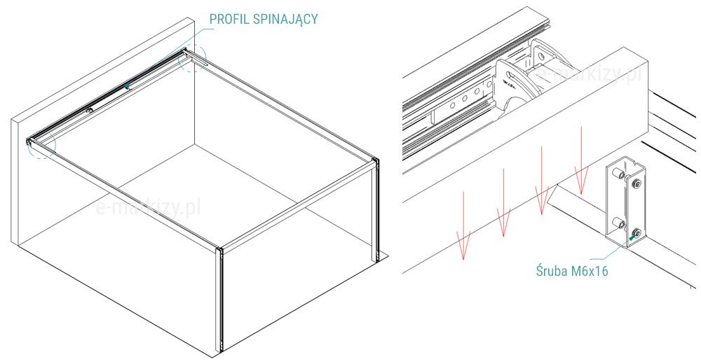 Profil spinający zawiera w swoim składzie złożenie Motorbox’a. Wsunąć profil spinający (kierunek ruchu obrazują strzałki przykręcić śrubą M6x16.