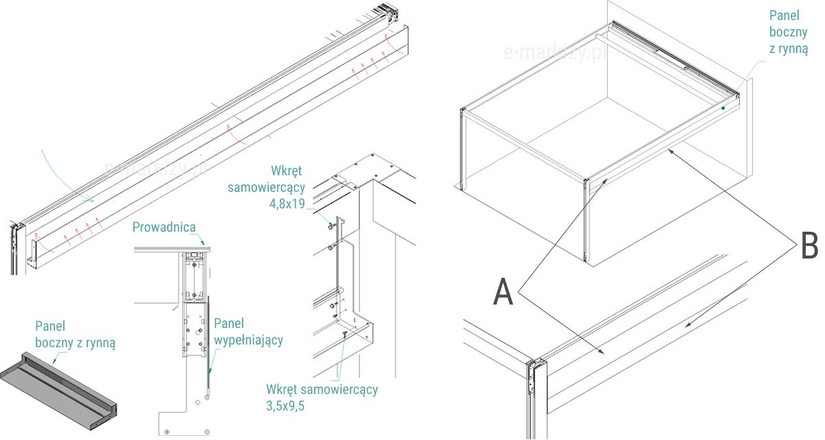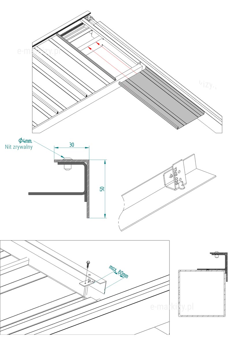 – przyłóż obróbkę do bocznej ściany prowadnicy i dokręć wkrętami samowiercącymi