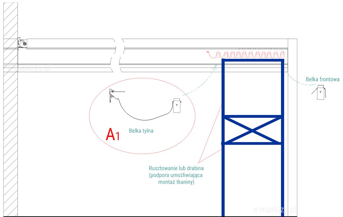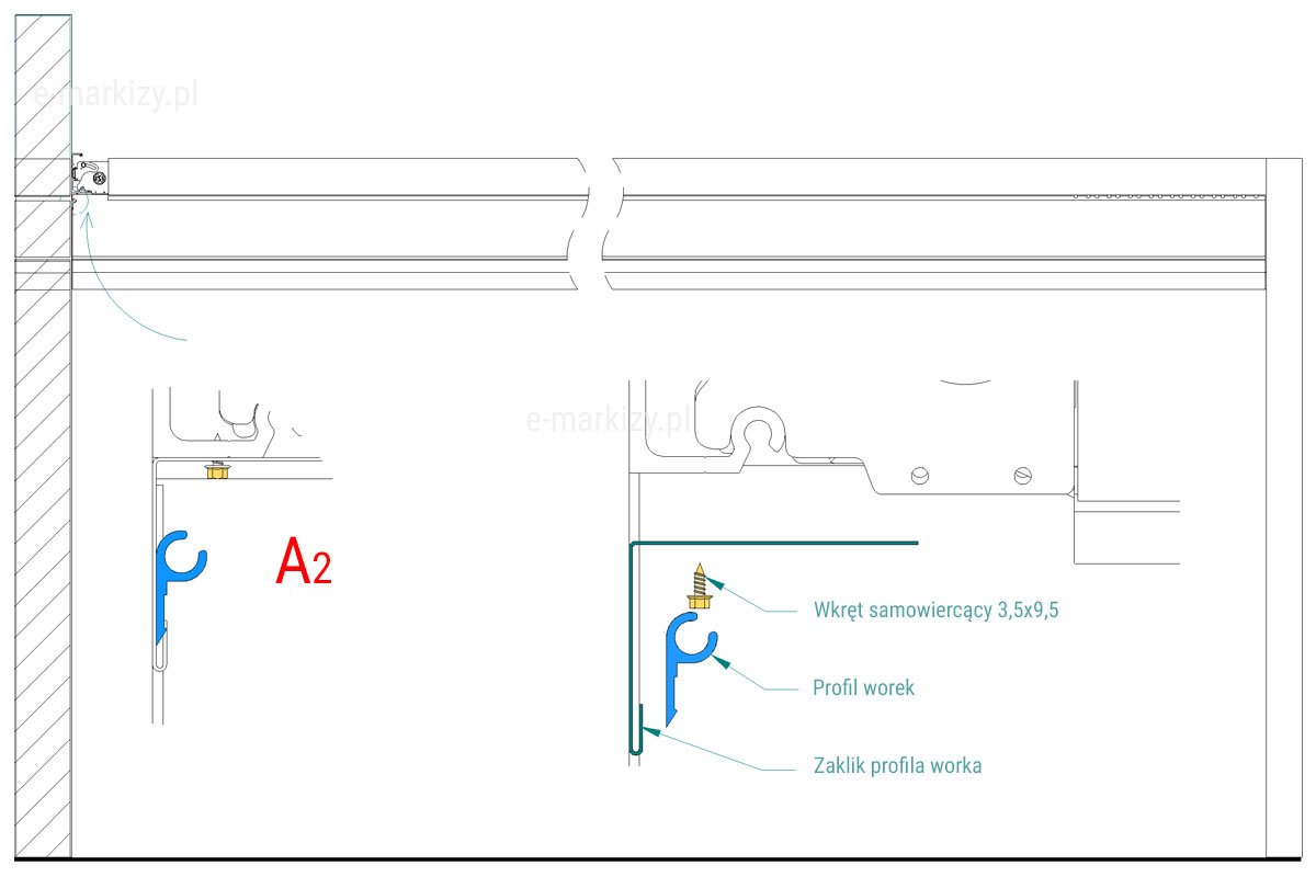 Końcową częścią modułu tkaniny jest belka tylna, do której doczepiony jest końcowy pas tkaniny (tzw. worek) (rys. A1). Worek należy zamocować do poprzednio zamontowanego profila (rys. A2).