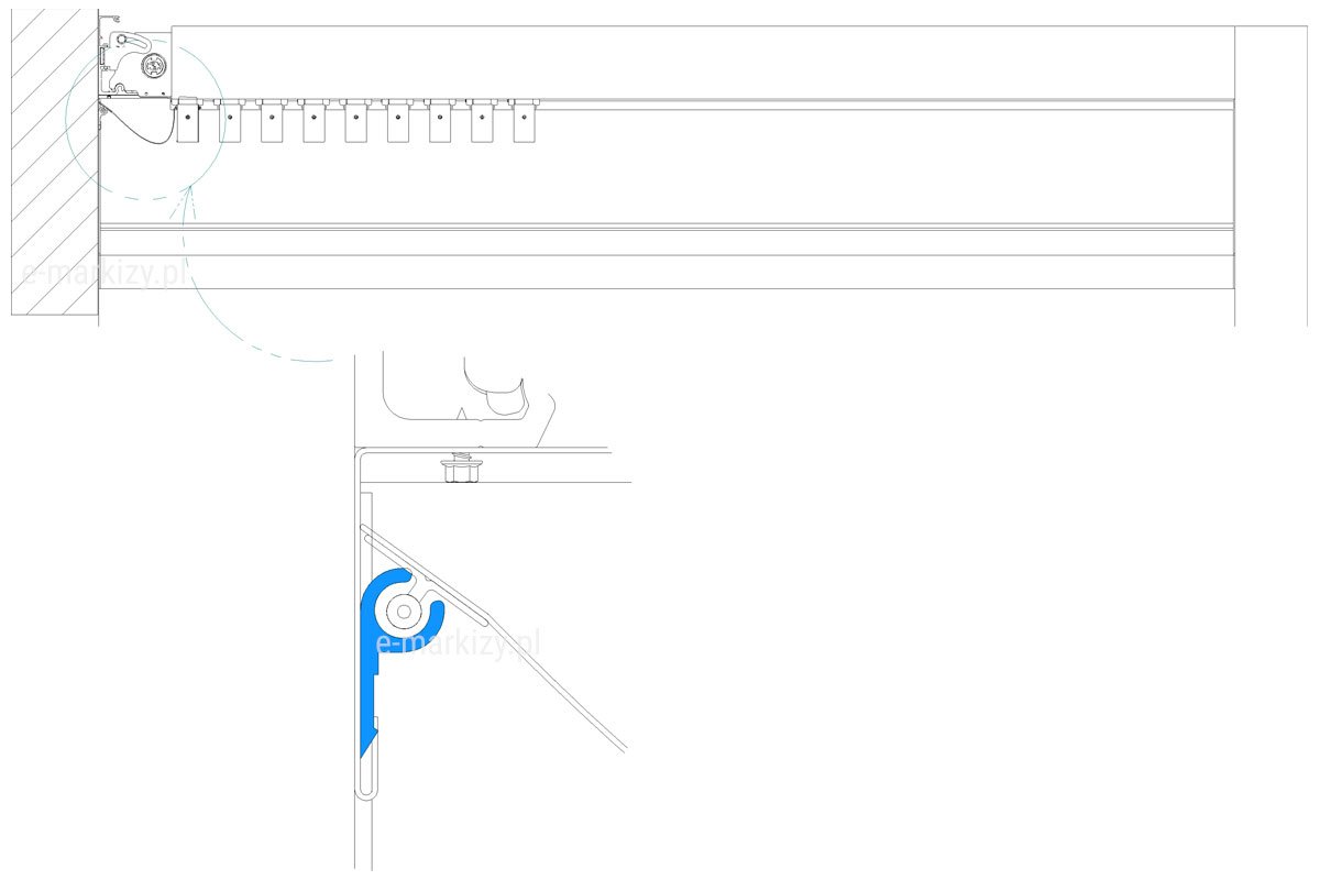 Zainstaluj kątownik montażowy do daszka systemowego na profilu startowym. Montaż tego kątownika występuje w kolejnych modułach nie posiadających motorbox’a.