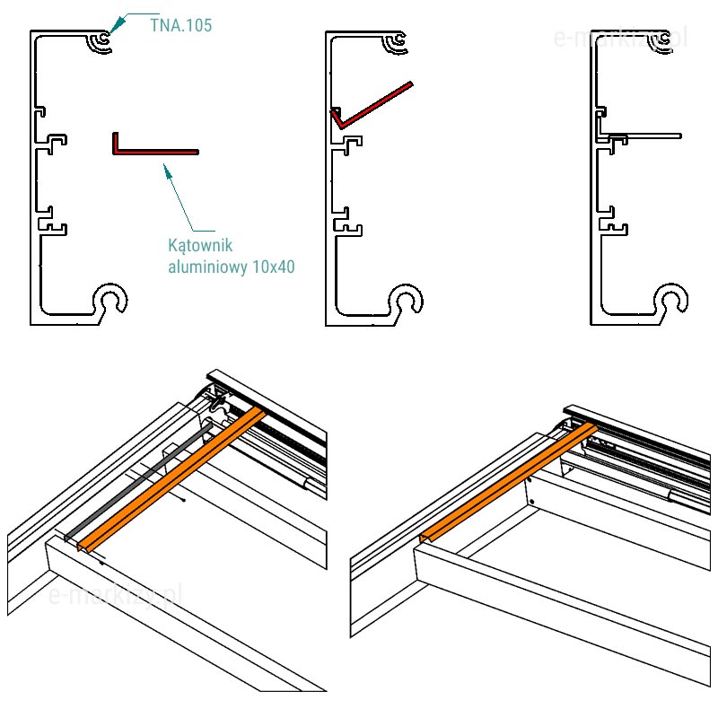 Resztę komponentu należy połączyc z profilem przednim podporowym montując kostkę profila spinajacego, korzystając z ówczesniej przygotowanych otworów.