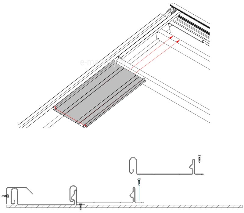 Montaż pierwszego panelu daszka systemowego. Wsuń pierwszy panel pod obróbkę boczną daszka systemowego, zablokuj wkrętami samowiercącymi.