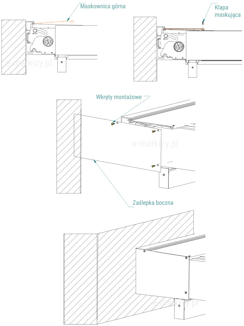 Wsuń maskownicę górną do profila startowego, korzystając z portu, Klapę maskującą należy