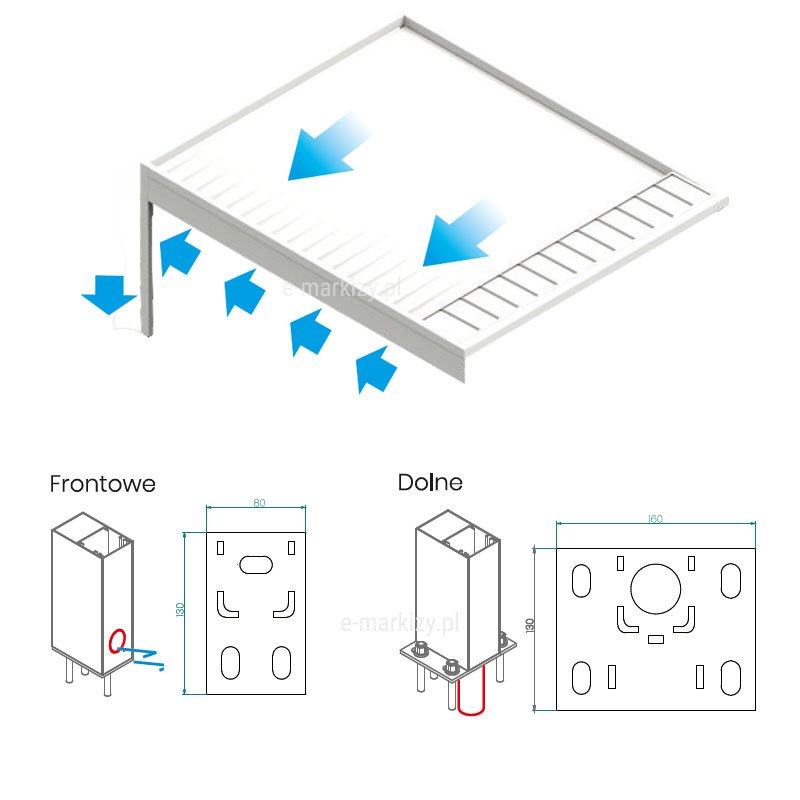 Panel boczny z rynną montowany jest z prawej lub lewej strony pergoli. Służy do odprowadzania wody. Stronę montażu ustalamy podczas zamówienia, w zależności od potrzeb. Woda odprowadzana jest do rynny, a następnie spływa przednią podporą.