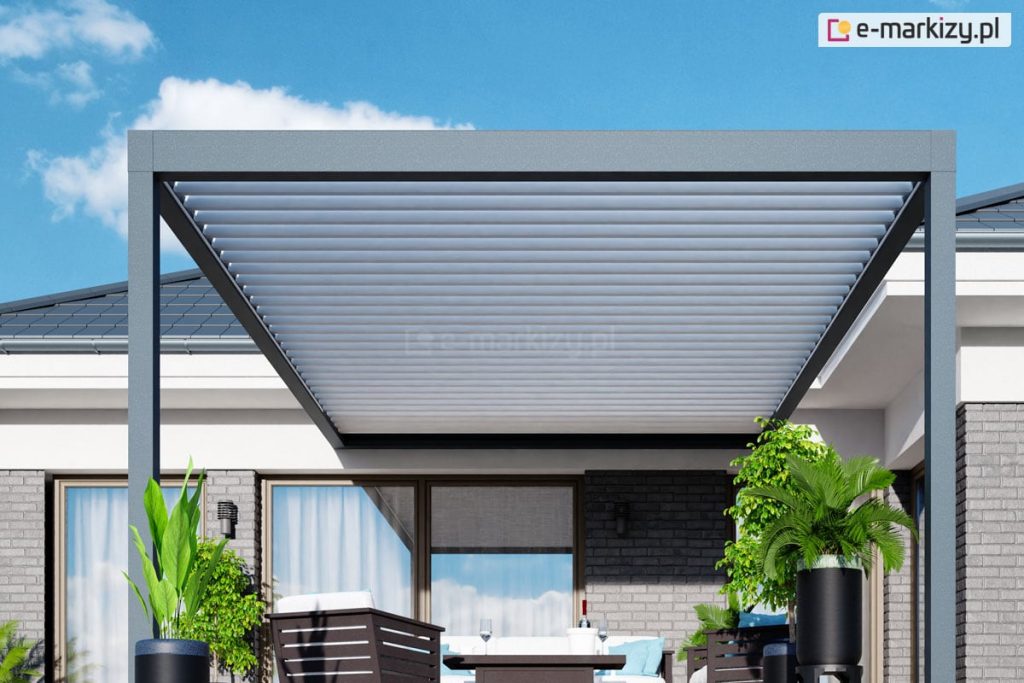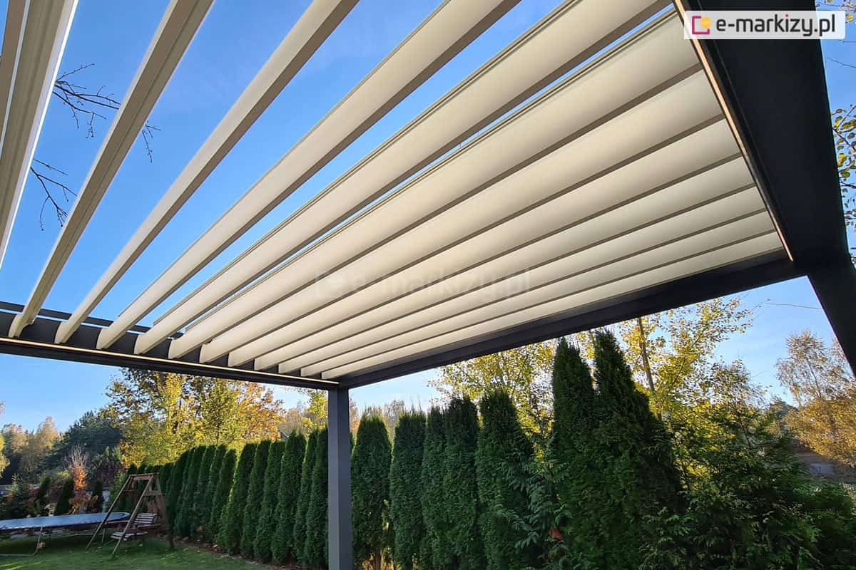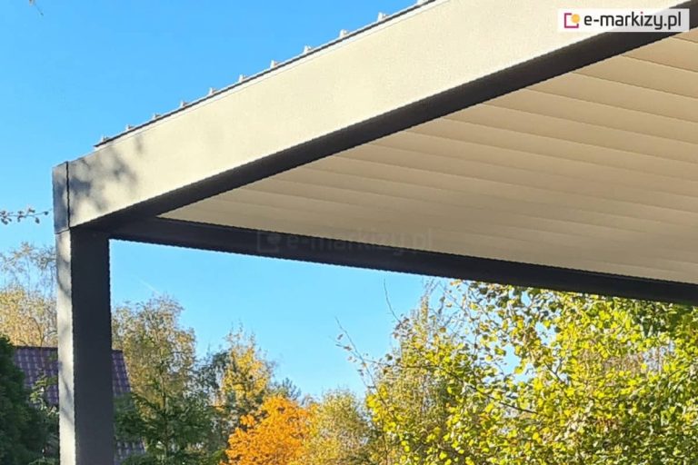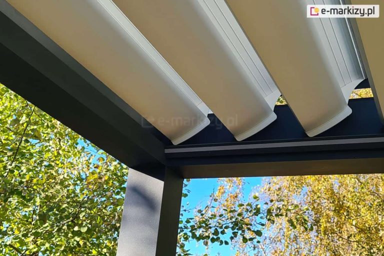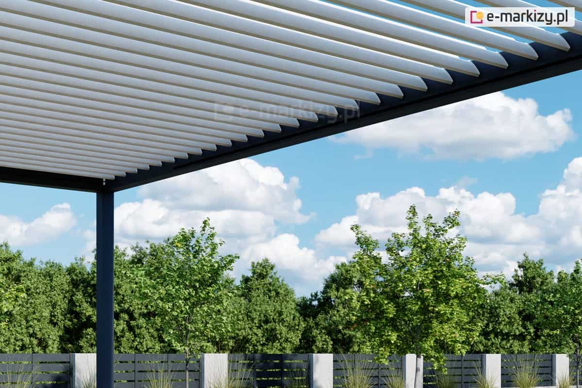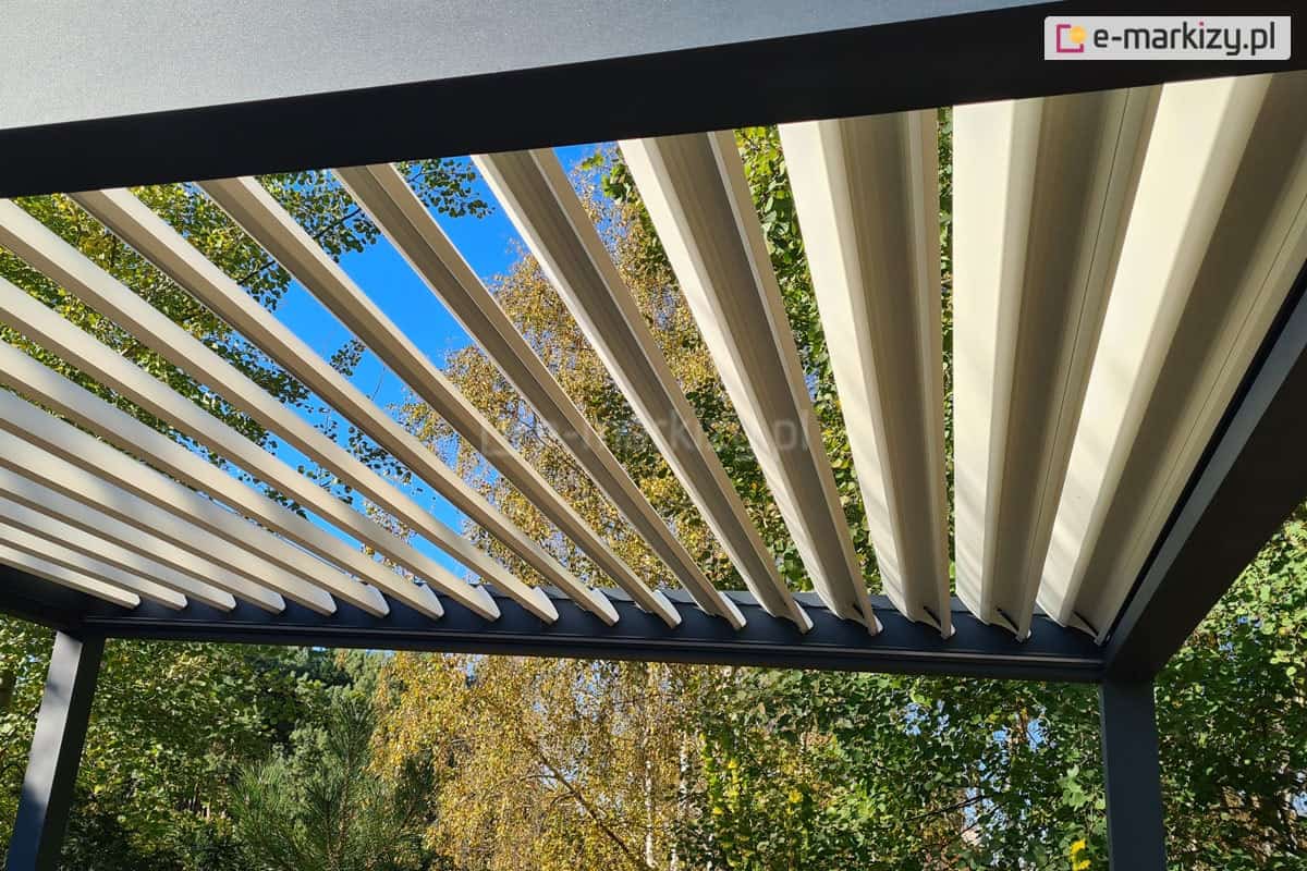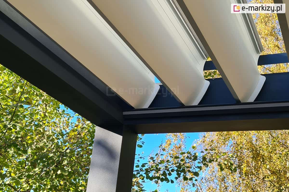 Należy pamiętać, że w tym modelu lamele nie zsuwają się, czyli nie ma możliwości całkowitego odsłonięcia dachu – działają wyłącznie w trybie obrotowym. Ich zakrzywiony profil w kształcie litery „Z” zapewnia jeszcze lepsze zacienienie przestrzeni pod pergolą, tworząc przyjemny, chłodny mikroklimat nawet w słoneczne dni.