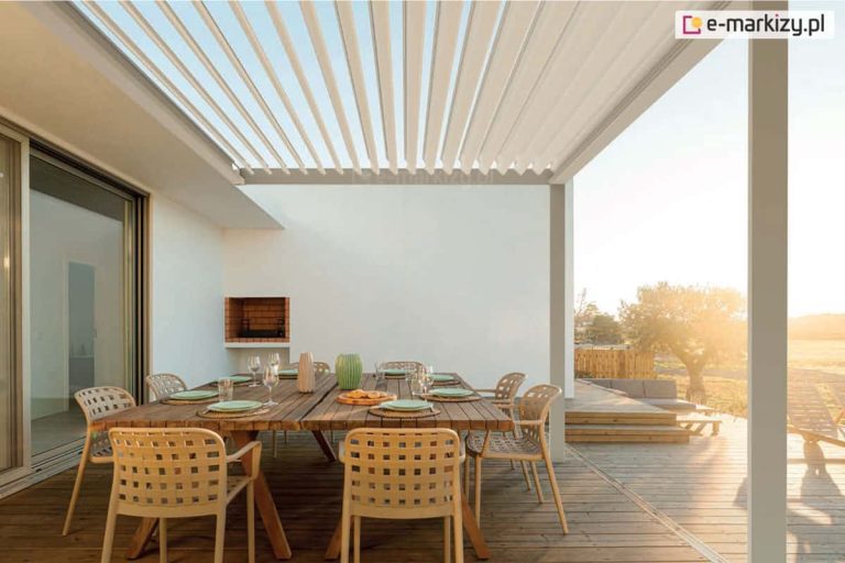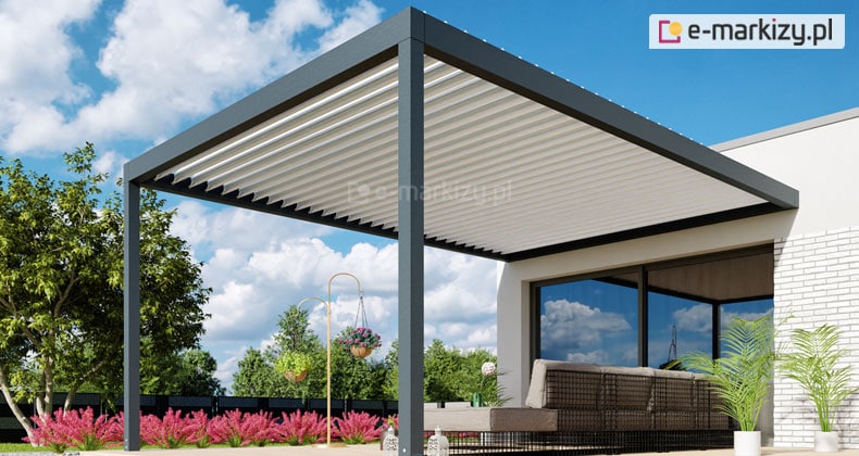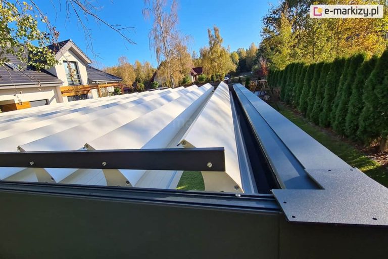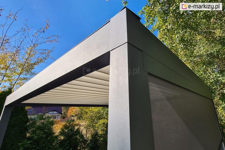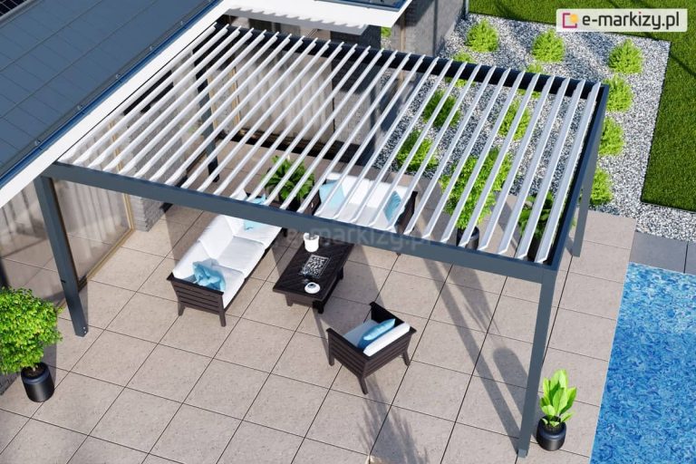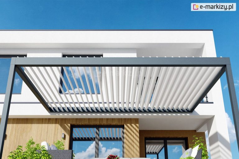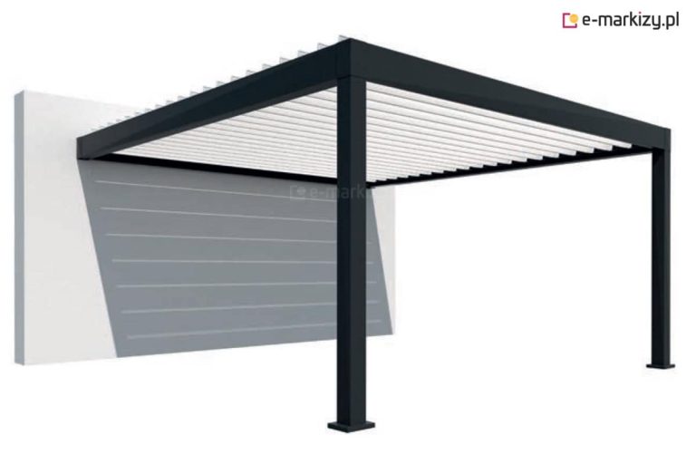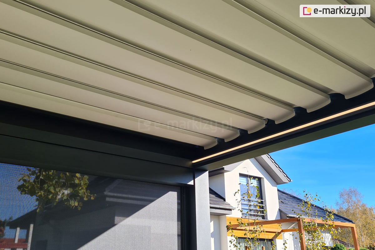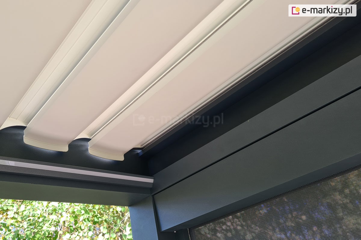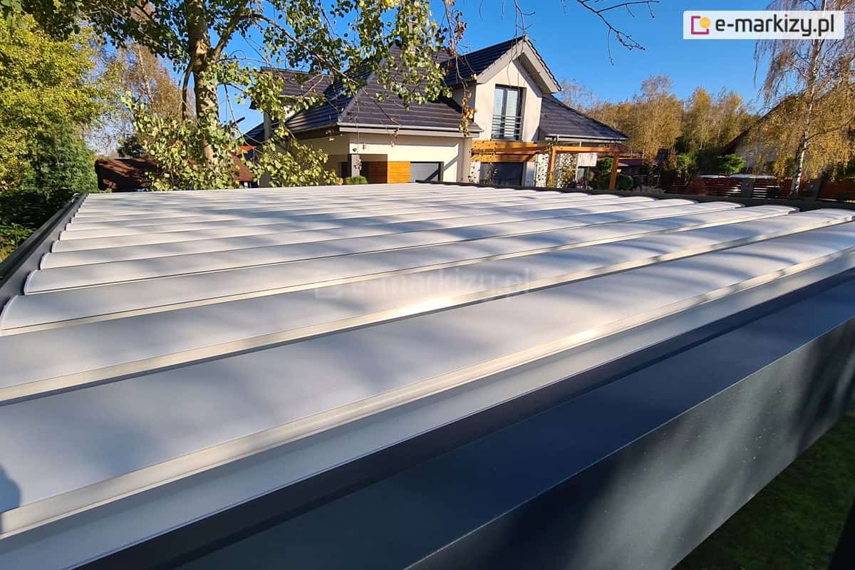 Należy pamiętać, że w tym modelu lamele nie zsuwają się, czyli nie ma możliwości całkowitego odsłonięcia dachu – działają wyłącznie w trybie obrotowym. Ich zakrzywiony profil w kształcie litery „Z” zapewnia jeszcze lepsze zacienienie przestrzeni pod pergolą, tworząc przyjemny, chłodny mikroklimat nawet w słoneczne dni.