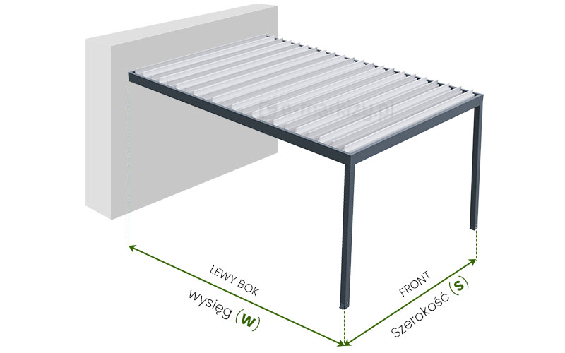 Pergola lamelowa przyścienna Bioline produkowana jest na wymiar. Jeżeli chodzi o szerokość to nie ma standardowych rozmiarów. Maksymalna szerokość to 450 cm, a maksymalny wysięg to 698 cm. Standardowa wysokość przednich podpór to 270 cm. Do zamówienia lub wyceny podajemy zawsze całkowitą zewnętrzną szerokość pergoli. W przypadku pergoli o gabarytowych wymiarach, konstrukcja wsparta jest na większej ilości podpór.
