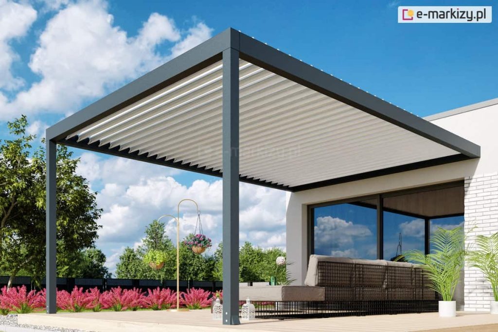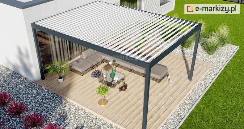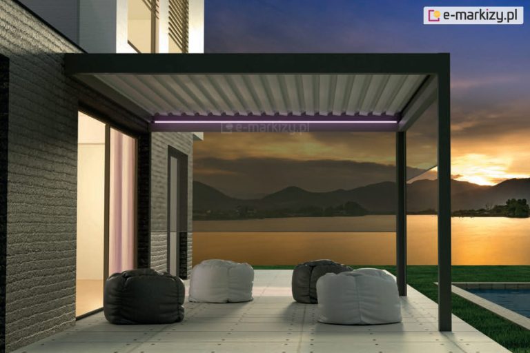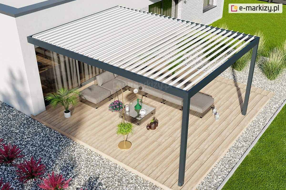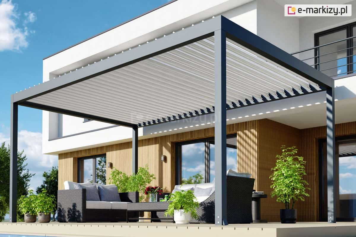 Pergola Bioline to eleganckie, lekkie i nowoczesne zadaszenie tarasu z aluminiowym dachem lamelowym. Jej największą zaletą są ruchome lamele, które można obracać w zależności od pogody i potrzeb. W pozycji zamkniętej skutecznie chronią przed słońcem i deszczem, a po uchyleniu wpuszczają naturalne światło oraz zapewniają przyjemną cyrkulację powietrza. Lamele mogą być ustawione równolegle lub prostopadle do ściany budynku, co pozwala lepiej dopasować pergolę do ułożenia tarasu. Cała konstrukcja wykonana jest z trwałego, ekstrudowanego aluminium i już w standardzie wyposażona jest w zintegrowany system odprowadzania wody. Dodatkowo pergolę można wyposażyć w nastrojowe, taśmowe oświetlenie LED, które podnosi komfort korzystania z tarasu także wieczorami.