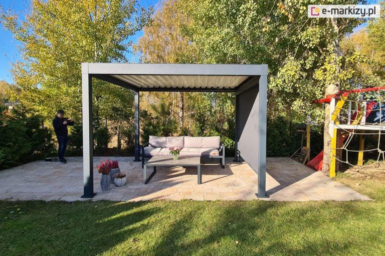 Pergola jest wykonywana na indywidualny wymiar, dzięki czemu idealnie dopasowuje się do potrzeb inwestora. Maksymalna szerokość to 4,5 m, a wysięg może wynosić nawet 6,98 m. Standardowa wysokość konstrukcji to 2,7 m, co daje poczucie przestrzeni i swobody. Popularne konfiguracje, takie jak pergola 3×4 m, świetnie sprawdzają się przy domach jednorodzinnych, natomiast większe rozmiary, np. 4×5 m, to częsty wybór właścicieli kawiarni i restauracji, którzy chcą zapewnić swoim gościom wygodne i chronione miejsce na świeżym powietrzu.