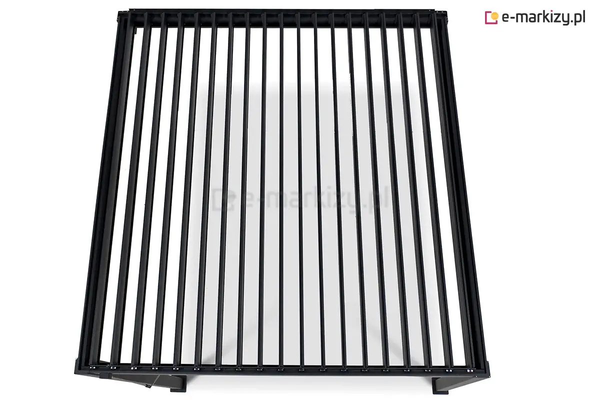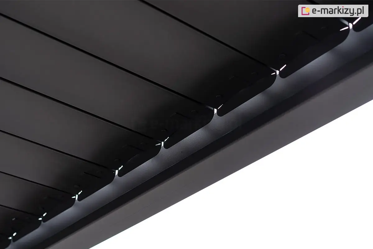 Woda deszczowa jest skutecznie zbierana z powierzchni dachu i odprowadzana ukrytymi kanałami do przedniej rynny, a następnie przez nogi konstrukcji poza obszar pergoli. Dzięki temu przestrzeń pod zadaszeniem pozostaje sucha i przyjazna, a Ty możesz korzystać z tarasu bez obaw o kałuże czy kapanie wody z krawędzi.