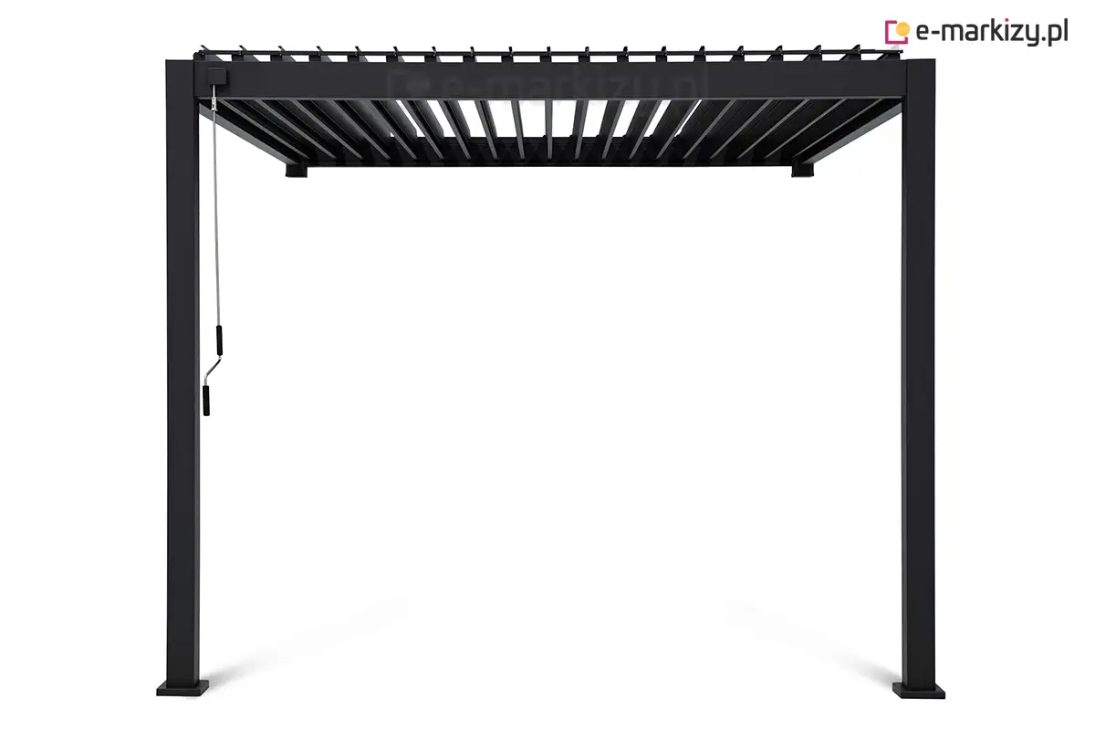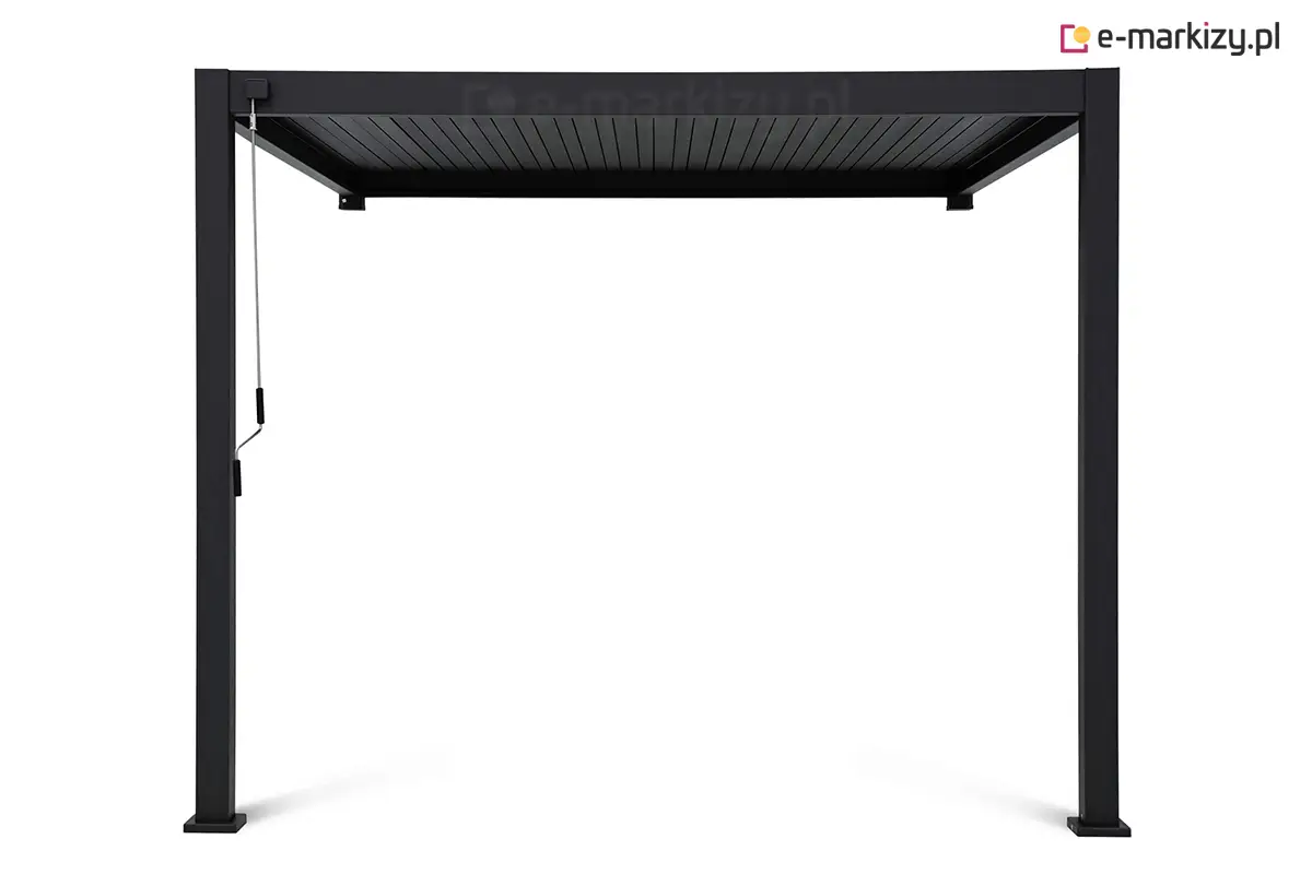 Pergola Gloria wyposażona jest w ruchome lamele dachowe, które możesz łatwo regulować ręcznie w zakresie 0°–90°. W pozycji zamkniętej dach jest całkowicie szczelny, chroniąc przed słońcem i opadami, a w pozycji otwartej wpuszcza maksimum światła i powietrza. Dzięki temu pergola jest idealnym rozwiązaniem na każdą pogodę – w jednej chwili zmieniasz stopień zacienienia i wentylacji zgodnie z własnymi preferencjami.