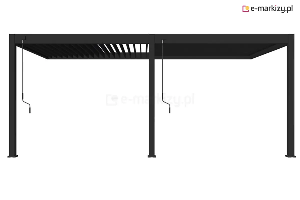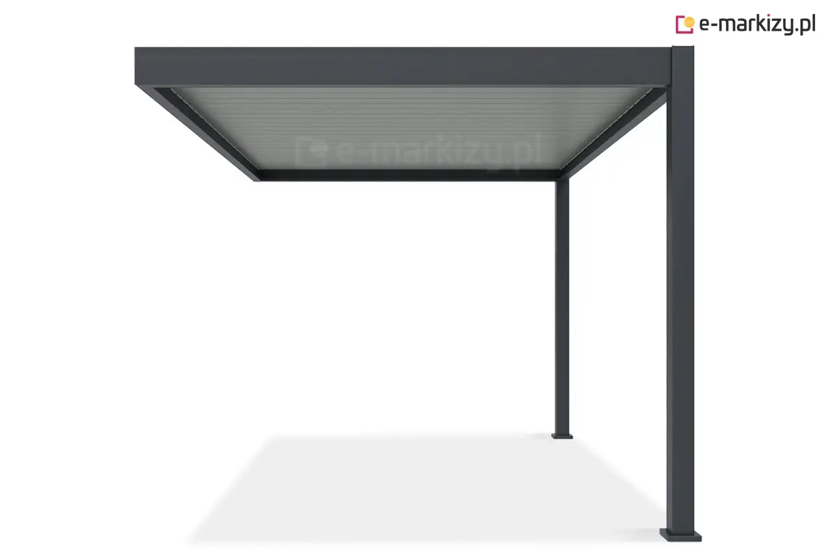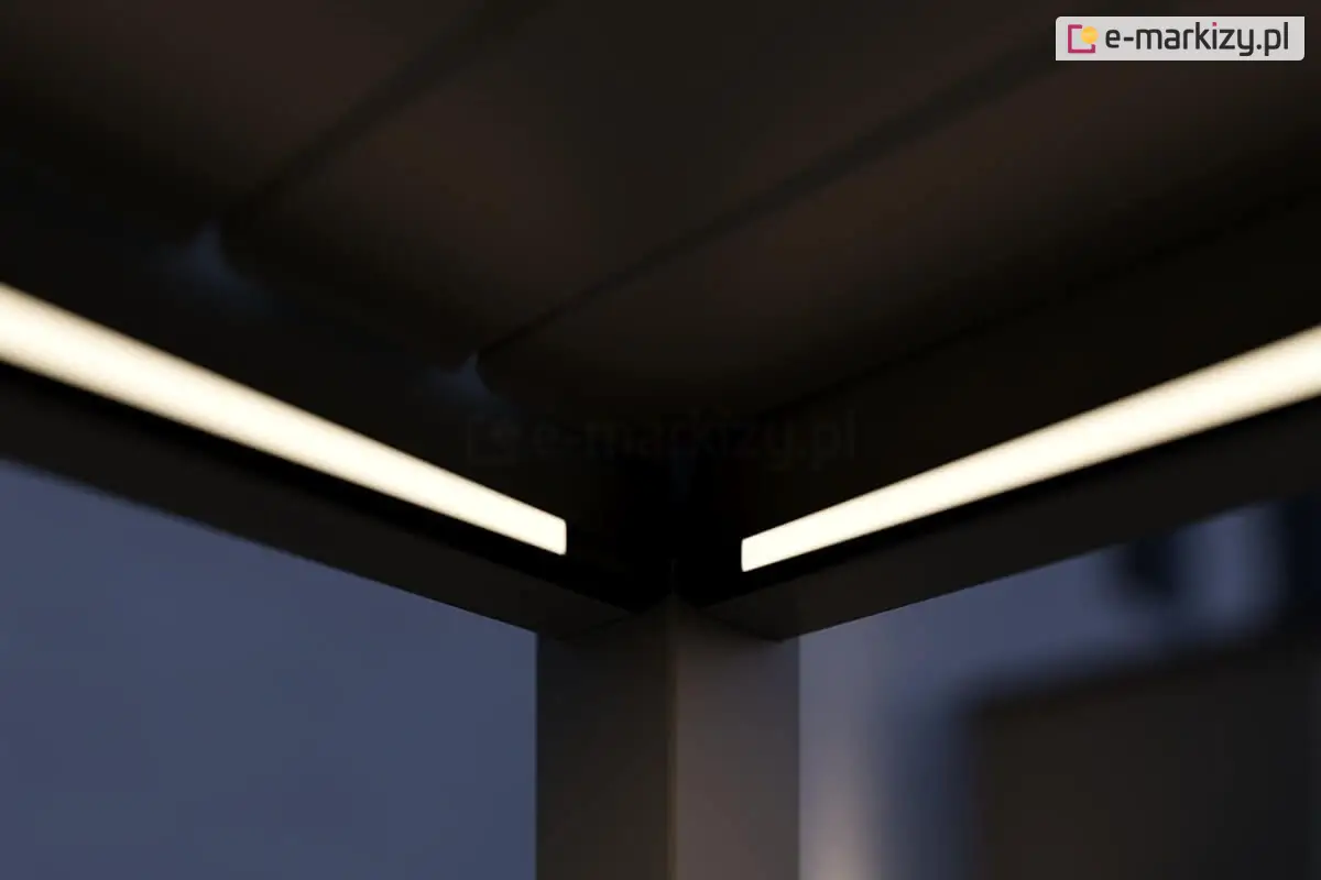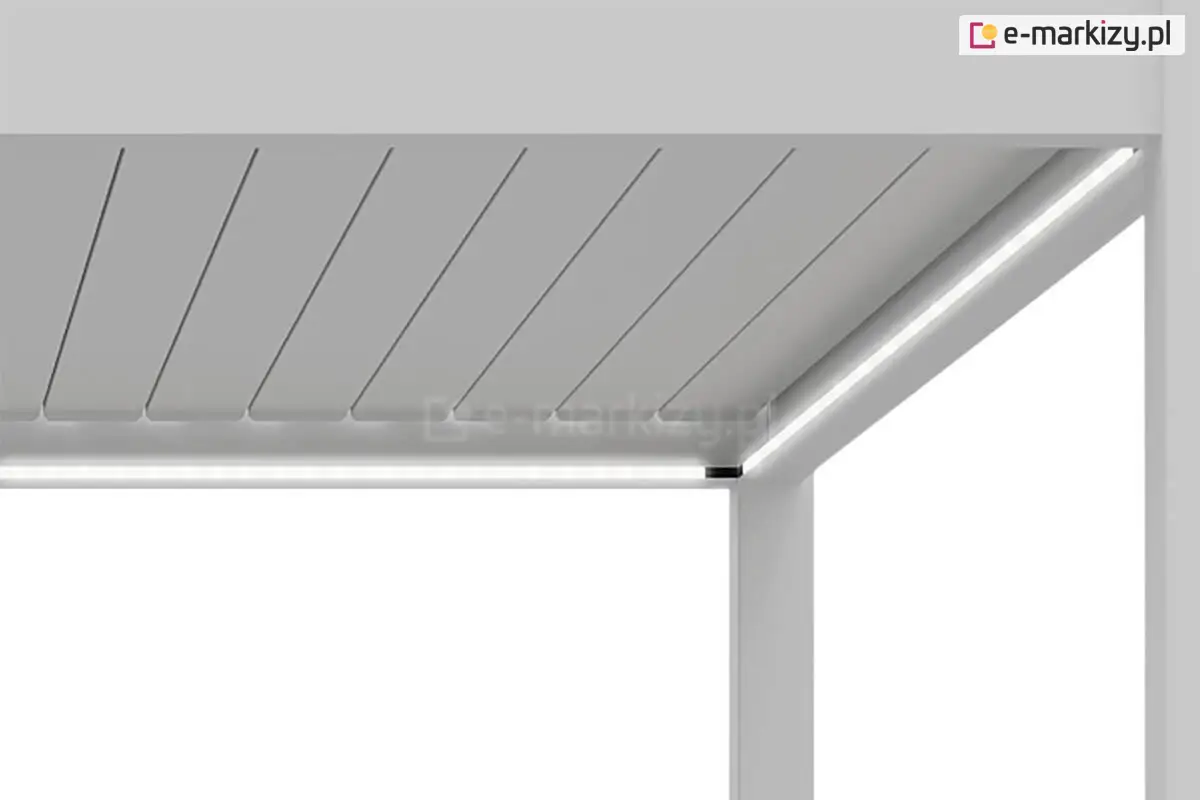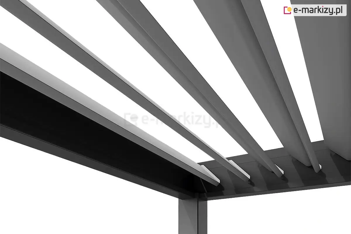 Dach pergoli Marlo składa się z aluminiowych lameli obracanych w zakresie do 135°, które pozwalają precyzyjnie regulować ilość światła i cienia pod zadaszeniem. W zależności od wybranego wariantu, system sterowania może być manualny – obsługiwany wygodną korbą – lub automatyczny, z napędem elektrycznym i pilotem w zestawie. Wersja elektryczna dodatkowo oferuje nastrojowe oświetlenie LED, dzięki któremu pergola staje się przytulnym miejscem wypoczynku także po zmroku.