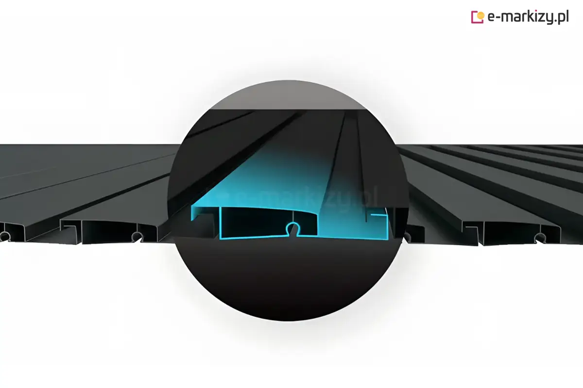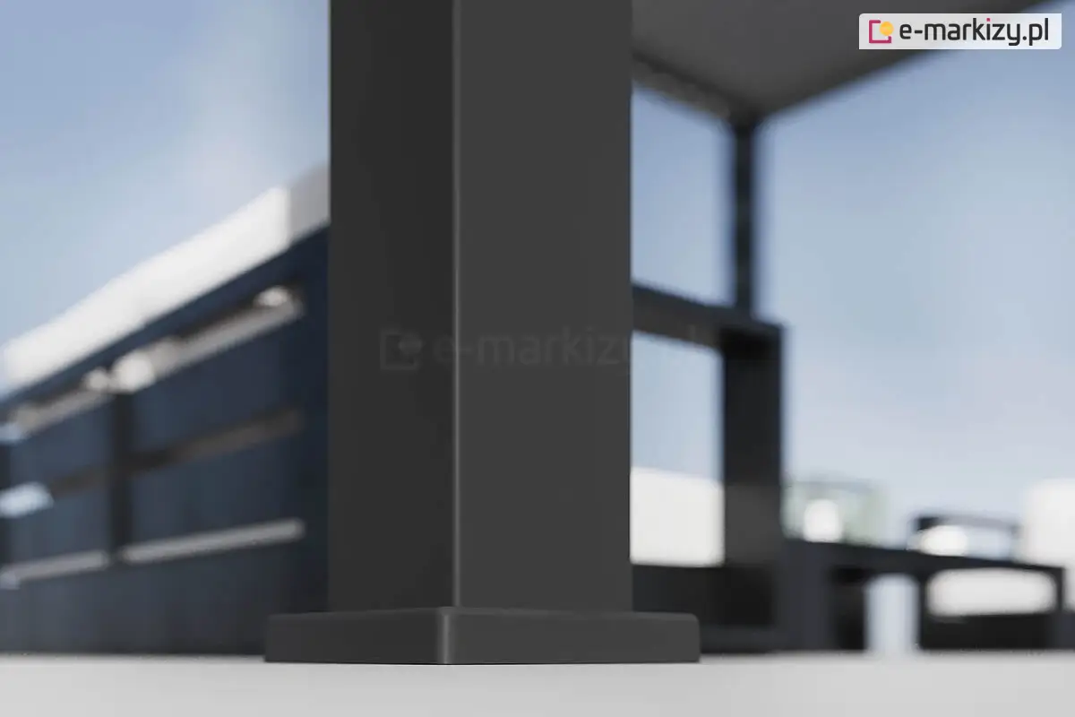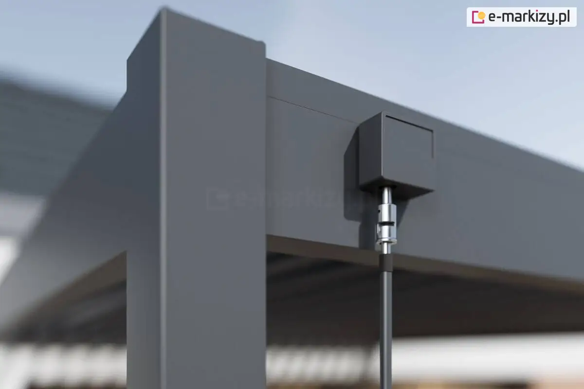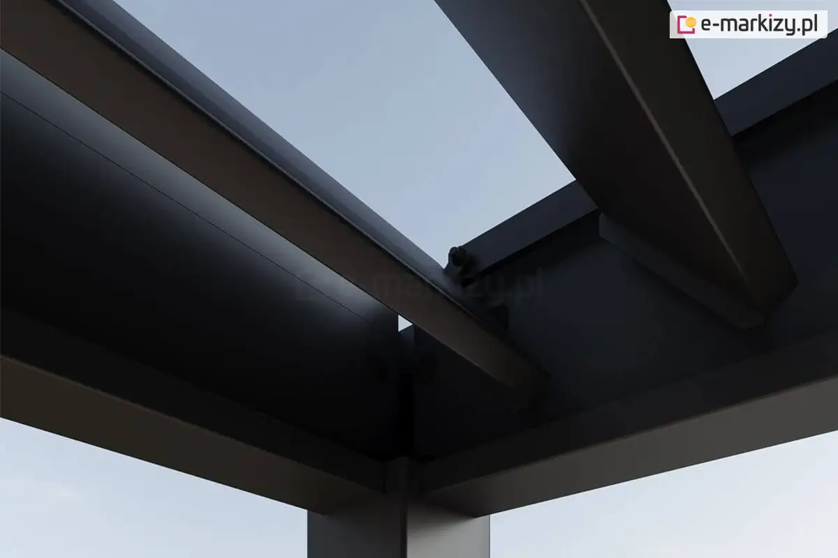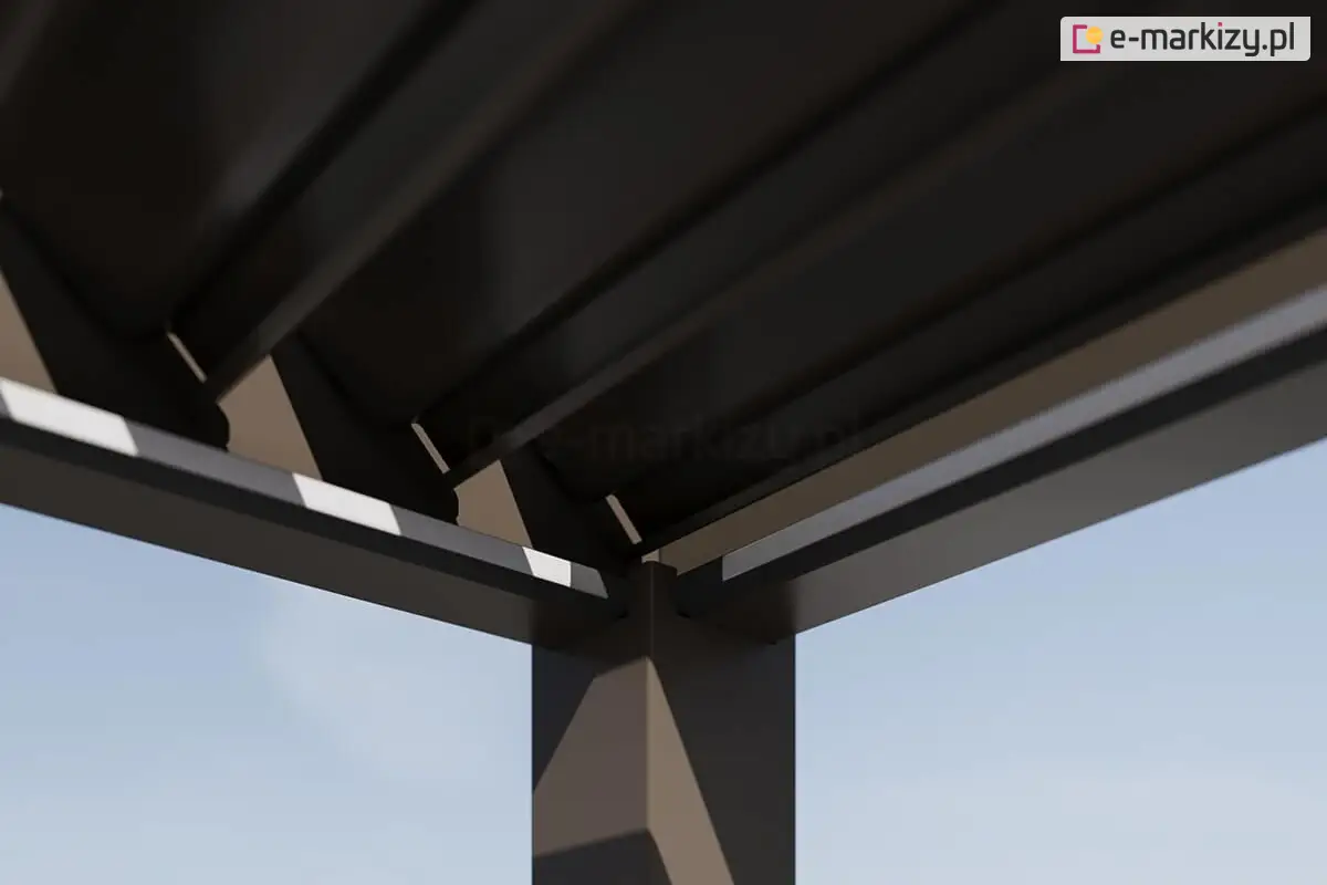 Pergola Marlo została wyposażona w przemyślany system rynnowy, który skutecznie odprowadza wodę deszczową z powierzchni dachu bez widocznych rynien i odpływów. Woda spływa przez ukryte kanały w ramach konstrukcji i zostaje odprowadzona przez słupy, co eliminuje kapanie z krawędzi i chroni przestrzeń pod pergolą przed wilgocią. To praktyczne i estetyczne rozwiązanie, które zwiększa trwałość konstrukcji i komfort jej użytkowania.