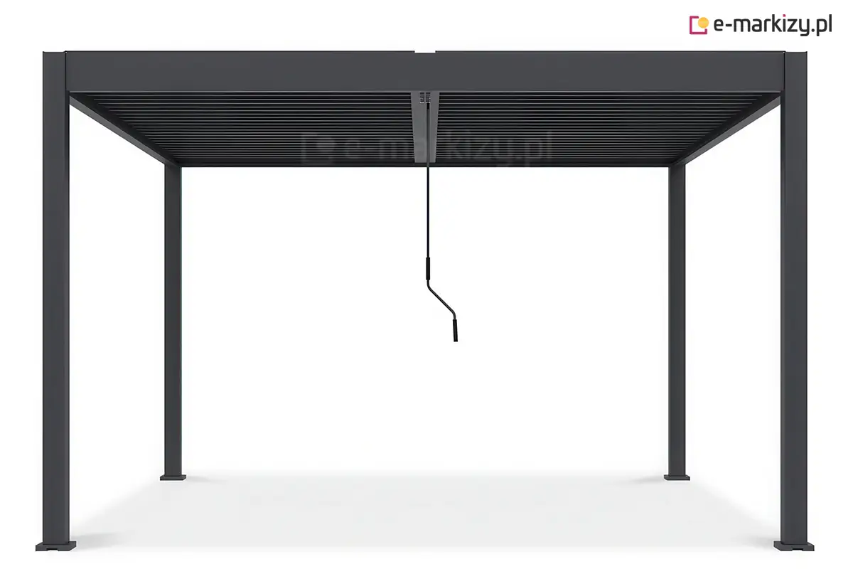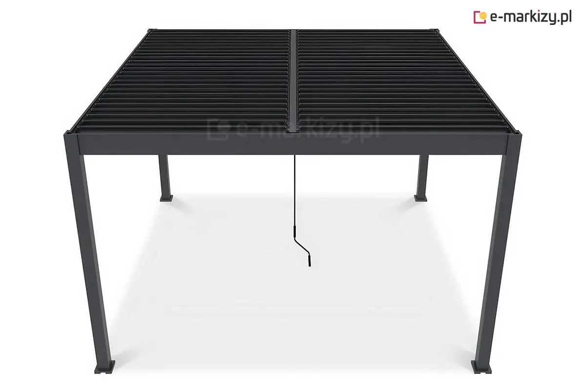 To, co czyni Marlo Duo konstrukcją naprawdę wyjątkową, to dzielony dach lamelowy, w którym lewa i prawa sekcja działają całkowicie niezależnie. Każdą część otwierasz lub zamykasz osobno, dostosowując ilość światła i cienia do aktualnych warunków oraz preferencji użytkowników. Sterowanie odbywa się wygodną korbą – mechanizmem prostym, niezawodnym i niewymagającym serwisowania. Całość pokryta jest prestiżową, odporną na warunki atmosferyczne powłoką AkzoNobel, która chroni konstrukcję przed korozją, przebarwieniami i szkodliwym promieniowaniem UV, pozwalając zachować idealny wygląd pergoli przez lata.