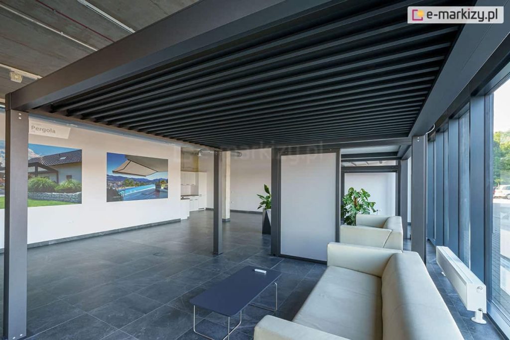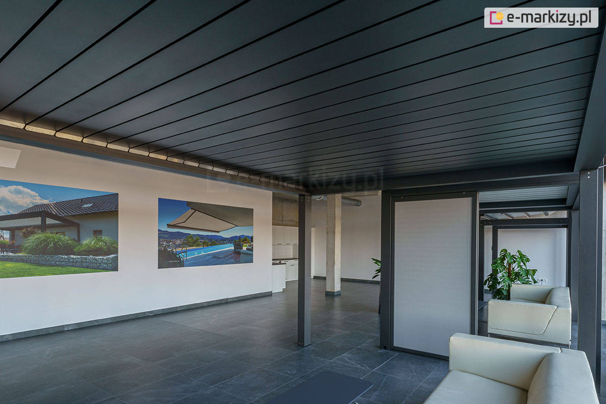 Elektryczna pergola z dachem lamelowym, poza zadaszeniem tarasu, oferuje ochronę przed wiatrem oraz wschodzącym i zachodzącym słońcem. Zabudowa pergoli osłonami zip w kwadratowej kasecie umożliwia korzystanie z ogrodu zimowego nawet podczas niesprzyjającej pogody. Refleksole do Pergoli SB350 mogą być mocowane ze wszystkich stron konstrukcji lub tylko z wybranych, zapewniając ochronę przed niepożądanymi spojrzeniami oraz promieniami wschodzącego słońca, co zwiększa komfort użytkowania przestrzeni na świeżym powietrzu.