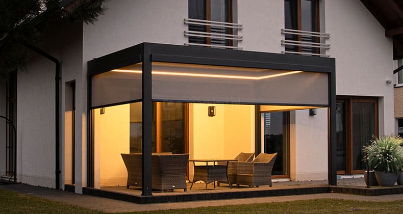 Najpopularniejszą formą zasłaniania ścian w pergolach są refleksole. To nic innego jak zewnętrzna osłona przeciwsłoneczna.