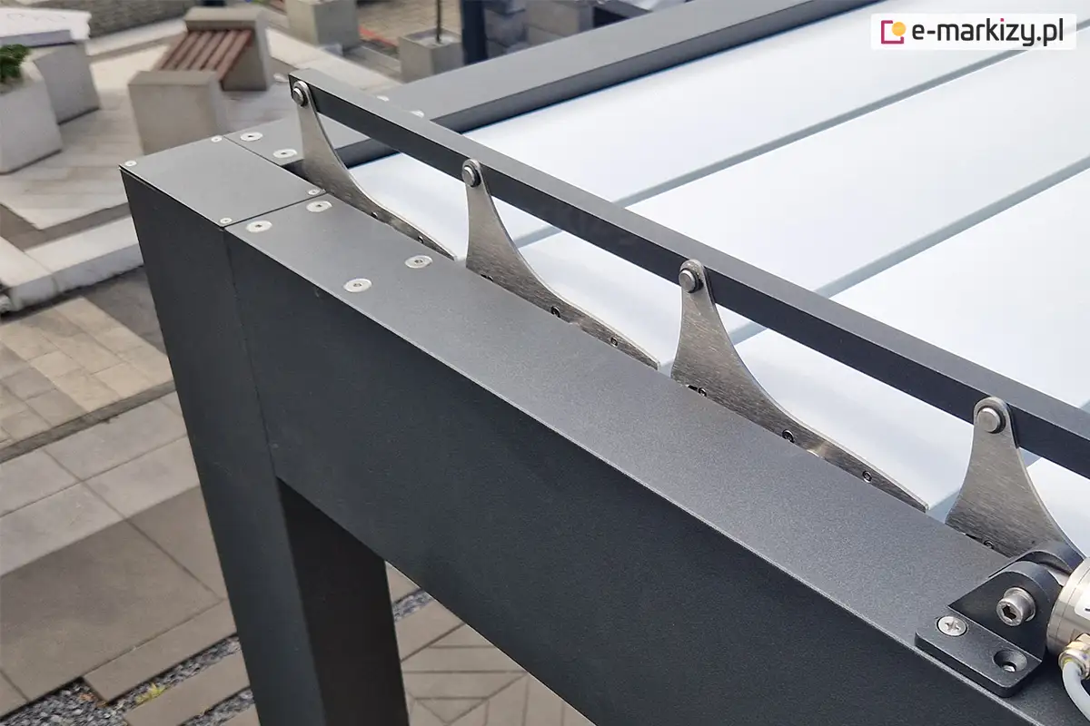 Konstrukcja pergoli bioklimatycznej wykonana jest z aluminium ekstrudowanego oraz wysokiej jakości stali, a precyzyjna obróbka materiałów zapewnia estetykę oraz wytrzymałość produktu klasy Premium. Wewnętrzne wzmocnienia łączeń elementów konstrukcji dodatkowo wzmacniają stabilność oraz odporność na warunki atmosferyczne. Woda odprowadzana jest zintegrowanym, niewidocznym z zewnątrz systemem rynien do odpływów w podporach. Trzy popularne kolory konstrukcji i lameli pozwalają na stworzenie jednolitej lub kontrastującej funkcjonalnej ozdoby budynku.