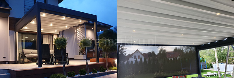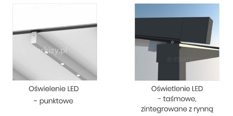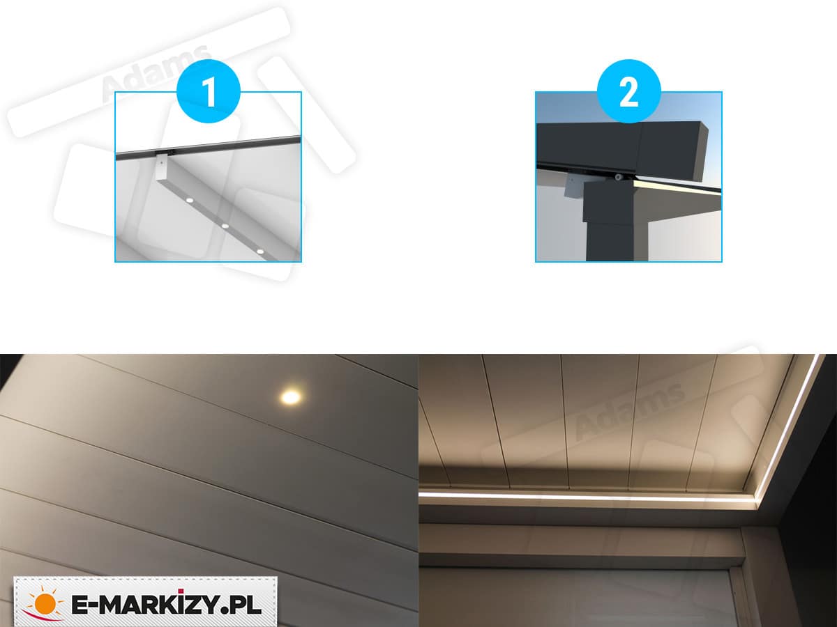 Pergola może być opcjonalnie wyposażona w oświetlenie LED. Występuje ono w dwóch wariantach.