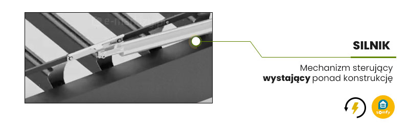 Napęd pergoli bioklimatycznej to Somfy Pergola (V 24 DC 250mm/24V/IP67) umożliwiający obrót lameli w zakresie od 0 do 120 stopni. Silnik 24V wymaga podłączenia co centralki Louver. Centralka powinna być podłączona do zasilacza 24V DC, a zasilacz do prądu 230 V AC.