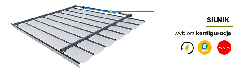 Wybierz rodzaj napędu. Zadaszenie można doposażyć w silnik elektryczny firmy Somfy, który automatycznie zwija tkaninę.