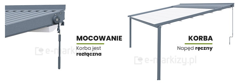 Opcja 1 Napęd ręczny-korbowy. W tym przypadku zwijanie i rozwijanie tkaniny, odbywa się za pomocą korby. Tkaninę możemy ustawiać i zatrzymywać w dowolnym miejscu. Korba jest rozłączna i można ją jednym ruchem zdemontować w razie potrzeby. Przy zamówieniu określamy stronę umiejscowienia korby.