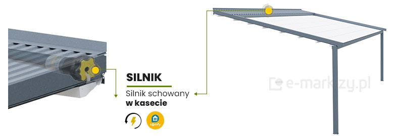 Silnik elektryczny z wbudowaną centralką bezprzewodową IO, która umożliwia sterowanie zadaszeniem za pomocą pilota bezprzewodowego IO oraz czujników atmosferycznych IO, a także korzystanie z opcjonalnego oświetlenia LED. Somfy IO to technologia 2 kierunkowa – nadajemy sygnał (np. aby dach pergoli został zwinięty) ale i odbieramy sygnał (np. na smartphonie możemy zobaczyć w jakim położeniu jest dach pergoli. Opcja dostępna po rozbudowaniu systemu o system Tahoma)